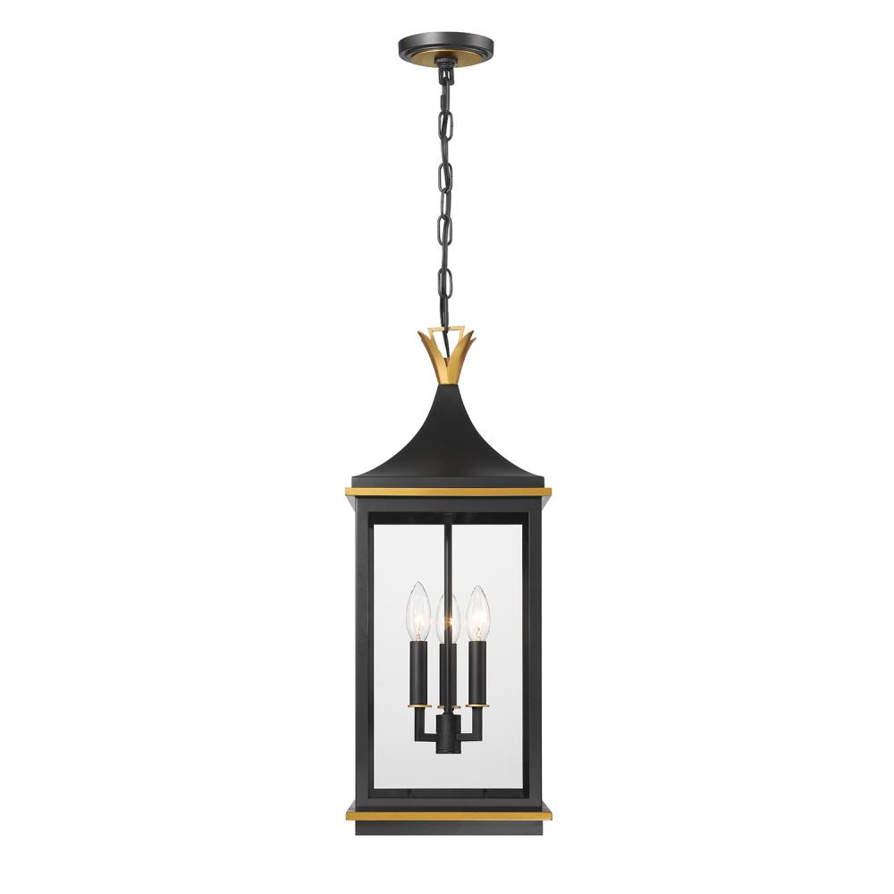The Simpson Outdoor Collection features a lantern-style design with a two-tone finish. Its elongated rectangular frame, elegant glass panels, and candelabra bulbs create a classic look with a contemporary edge. The collection includes two options for customizing the top: a gold crown cap for a traditional flair or a sleek angled loop for a more contemporary appearance. This versatile design adds a stylish touch to any outdoor setting.