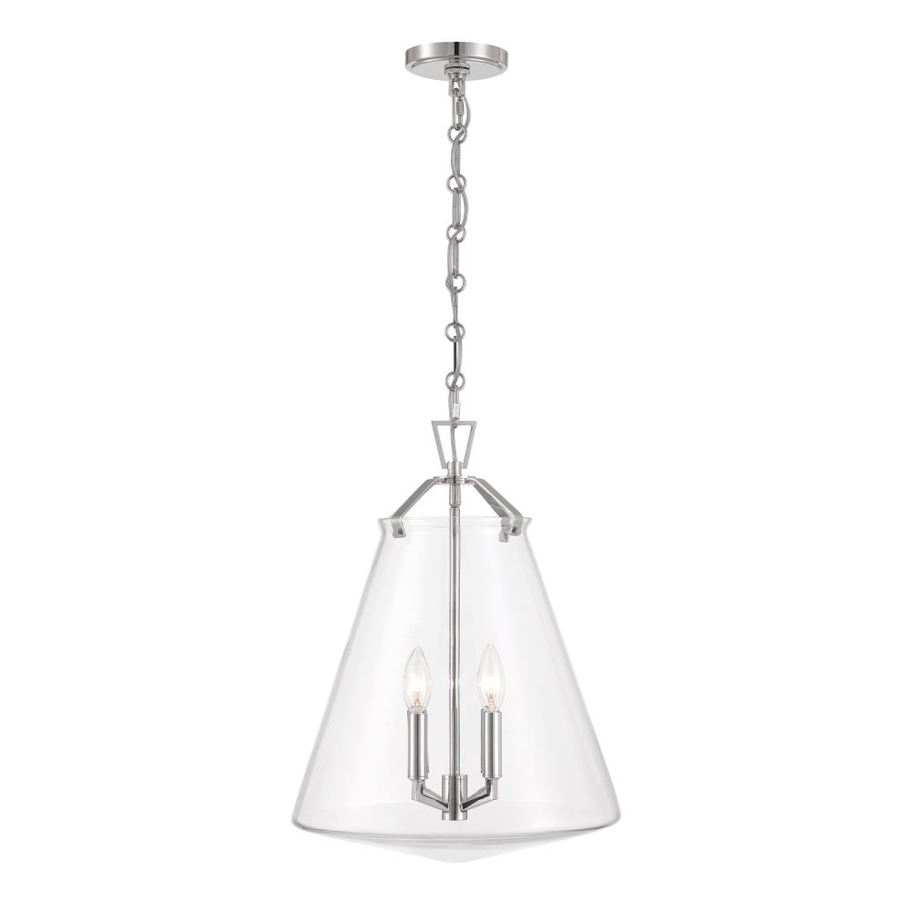The Voss Collection is a sleek, enduring design with subtle angular details, offered in various finishes and sizes for your unique space. It’s clear glass cone-shaped pendant is closed on the bottom and fastened with metal on its open top. The patterned chain detail adds a touch of character to its streamlined design. The Voss Collection is not confined to a single style; it is a versatile design that suits a variety of spaces, from minimalist and modern to classic and eclectic.