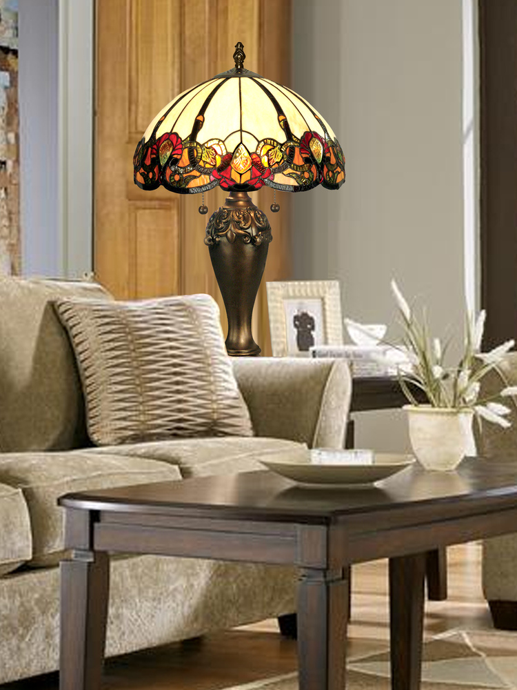 Ablaze with prismatic color, the Northlake table lamp is both artistic and functional. Almost 400 pieces of art glass, each piece hand rolled and individually set in copper foil, glow warmly on the dome shaped shade. The intense earthen tones in this lamp will beautifully accentuate any decor in your home or office. Delicate carving on the metal base’s top and raised pedestal bottom signify the quality and artisanship you have come to expect from Dale Tiffany. The base is finished in a beautiful antique bronze finish.