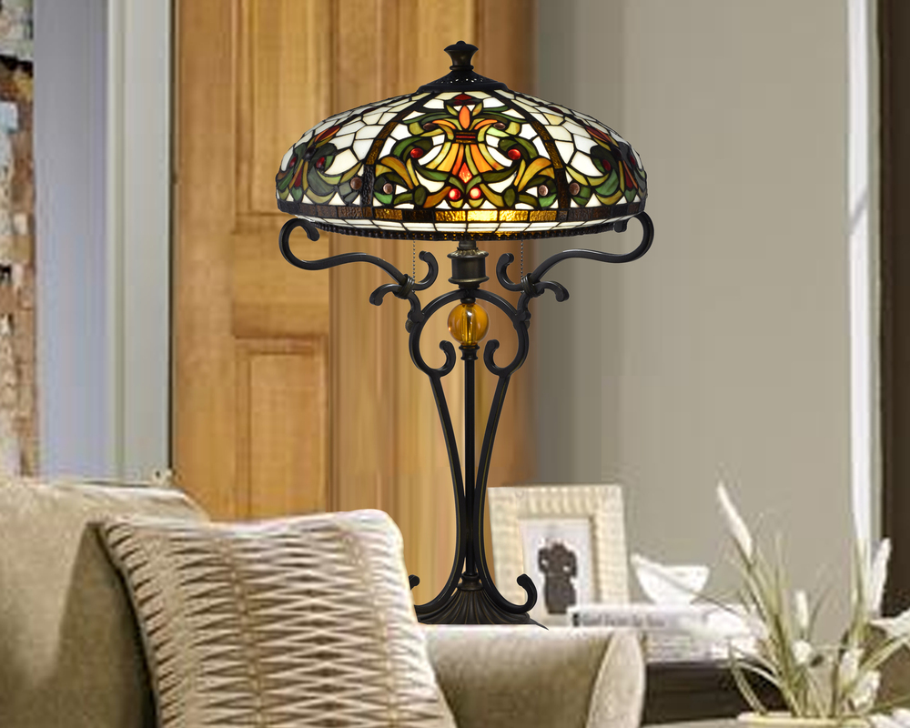Inspired by French Nouveau glassmaker, Emile Galle, the Boehme series is guaranteed to add a French flair to just about any room in your home. This gracious table lamp features 696 pieces of glass in lovely earth tones that have been etched and double overlaid. The addition of traditional Tiffany style art glass jewels in complementing colors creates a marriage of the two classic styles. A bold, yet graceful iron base in an antique golden sand finish, with an amber glass globe set inside the scrollwork brings the two distinct styles together for one lovely result.