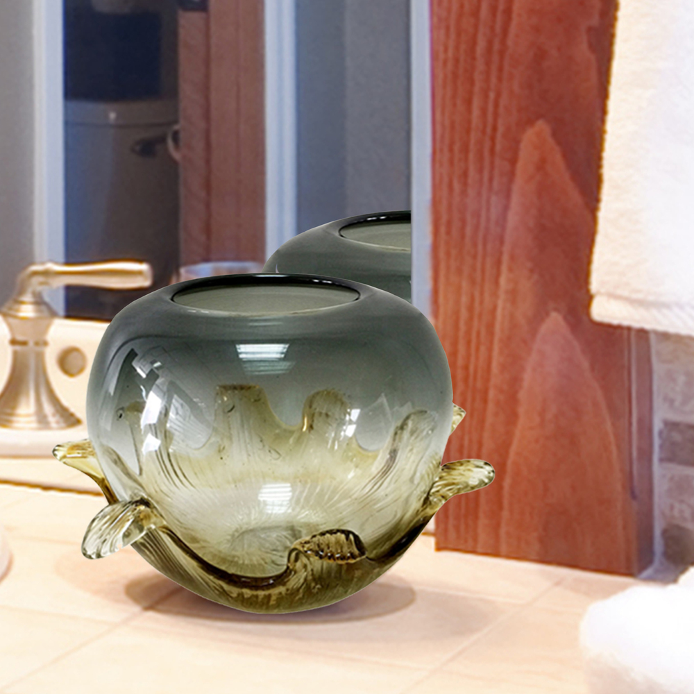 Our lovely Amber Leaf Vase does double duty as both a functional vase and one of a kind objet d’art. The vase features a base that is a three dimensional leaf crafted of textured Favrile art glass in a blended amber and green tone. Inside the leaf, sits a pretty round vase of Favrile glass in iridescent smoky green. Amber Leaf is constructed of hand blown Favrile art glass, which embeds the color within the glass itself. This process allows for subtle variations in color, tone and texture, which means no 2 pieces, are exactly alike. The perfect way to display a small nosegay of your favorite blossoms, our Amber Leaf Vase also makes a beautiful statement when displayed on its own in any room in your home.