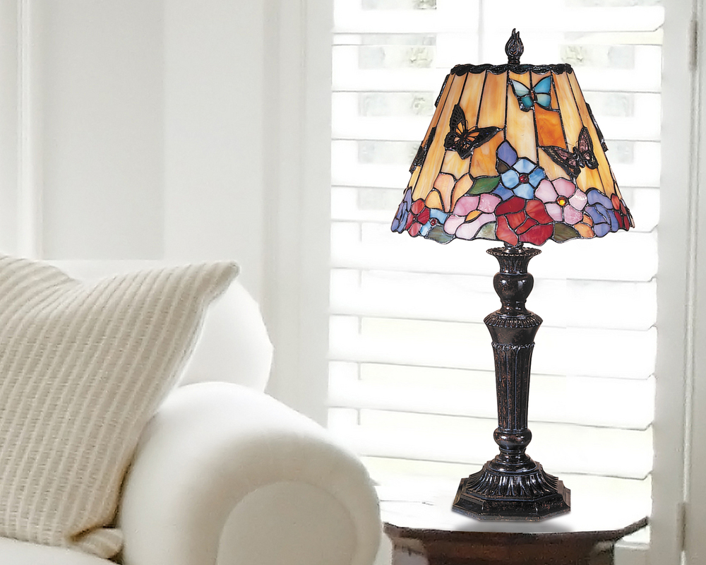 Fanciful butterflies flutter above a field of vivid peonies in this bright and cheerful table lamp. 273 pieces of art glass, each individually hand rolled and copper foiled, are resplendent in all the colors of springtime. Intricate filigree detailing overlays on the butterflies and around the top edge of the shade adds an extra artistic element. A tastefully carved zinc base, in a fieldstone finish provides just the right accent to this lovely lamp.