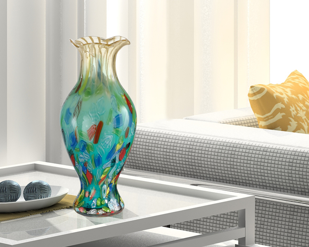 Our Festive Ruffle Vase will make every day seem like a celebration in your home. The tall cylinder is rounded at its center and features a background mixture of light blue towards the bottom and mint green near the top. Geometric shapes in red, yellow, dark blue, dark green, amber and white create an abstract impression of a colorful school of tropical fish under the sea. The elongated neck is tapered clear glass that is infused with white and light yellow striping that runs upward to its gently scalloped mouth. The generous 19” height is perfect to accommodate your longest stemmed blossoms. A brilliant centerpiece on a large dining table, console or hearth, our Festive Ruffle Vase is makes an impressive statement on its own that you will proudly display in your home for many years to come.