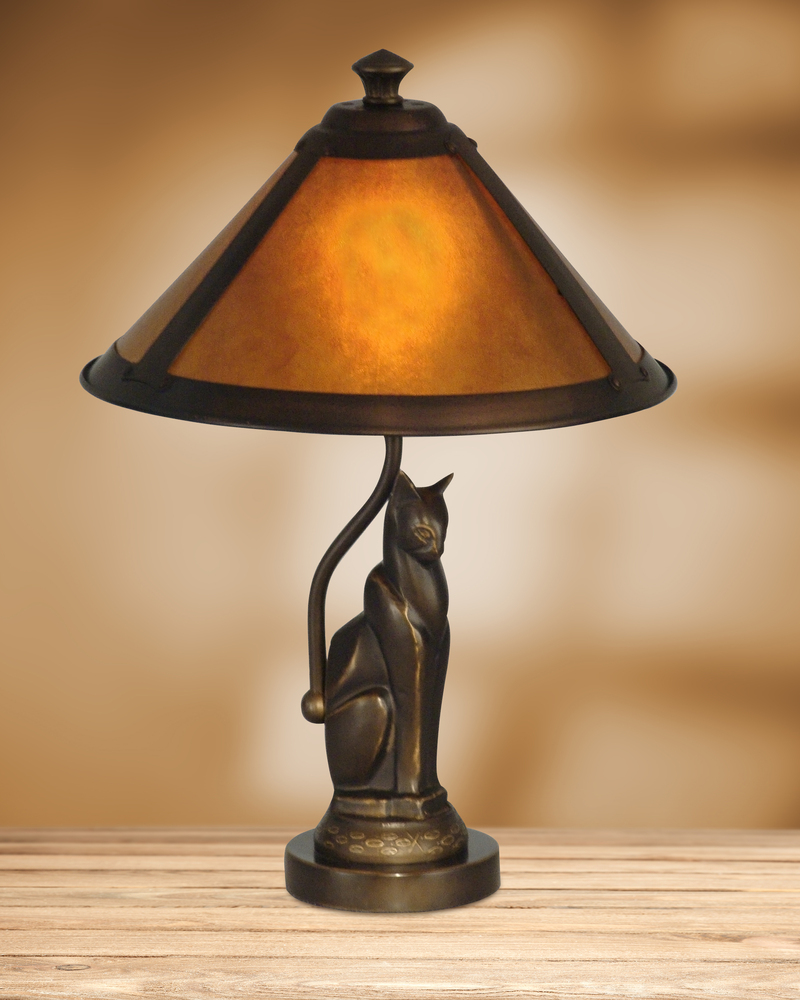 Whether or not you are a cat lover, add a touch of feline grace to any room in your home with this delightful accent lamp from our Classic Mica Collection. A cone shaped shade in lustrous deep amber mica sits atop a round pedestal base, finished in antique bronze, which features a sleek, aloof cat. Cats have been long been considered to be symbols of good luck and fortune. You will count your lucky stars when you adopt this little kitty who will seamlessly make his home in your den, study, bedroom or office.
