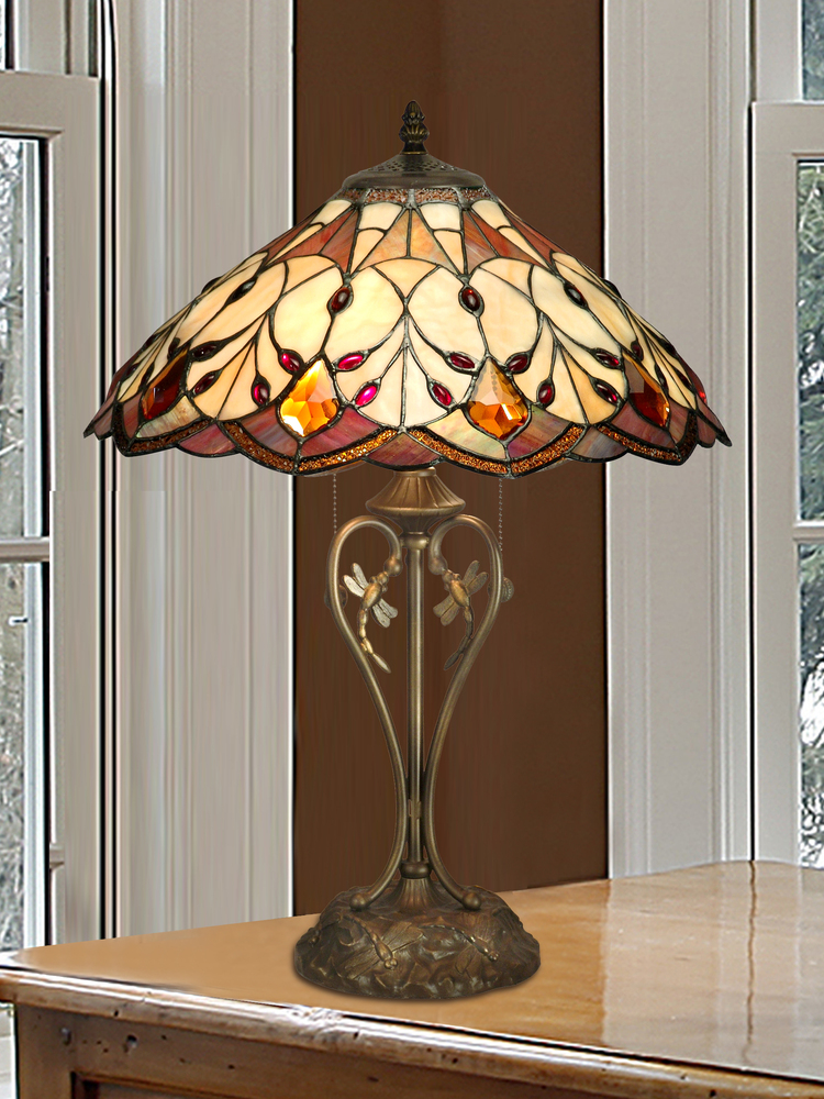 A collection of circles, triangles, diamonds and ribbons all come together in beautifully scalloped shade on our Marshall Table lamp. 230 pieces of art glass and art glass jewels are each hand rolled and set in copper foil in homey earth tones that will add warmth and sparkle to any room in your home. Tiffany’s iconic dragonfly is featured in the heart shaped scrollwork and is also cast into the pedestal of the base itself, which is finished in antique bronze.
