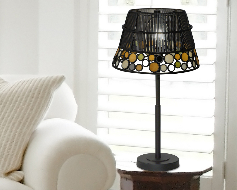 Our Pasqual Mesh Tiffany Table Lamp features a contemporary style that will adapt to your home’s evolving décor. The shade features a metal mesh top, wrapped in a metal frame that is finished in Antique Bronze to give the fixture its industrial feel. A wide bottom border of circular art glass pieces in amber, white and yellow, outlined in matching filigree adds to the contemporary vibe. The modern metal base is finished Antique Bronze to match the mesh in the shade, and features a sleek center column and round pedestal. A chic look when displayed in pairs on matching end tables or nightstands, our Pasqual Mesh Tiffany Table Lamp will provide you with many years of stylish and reliable lighting.