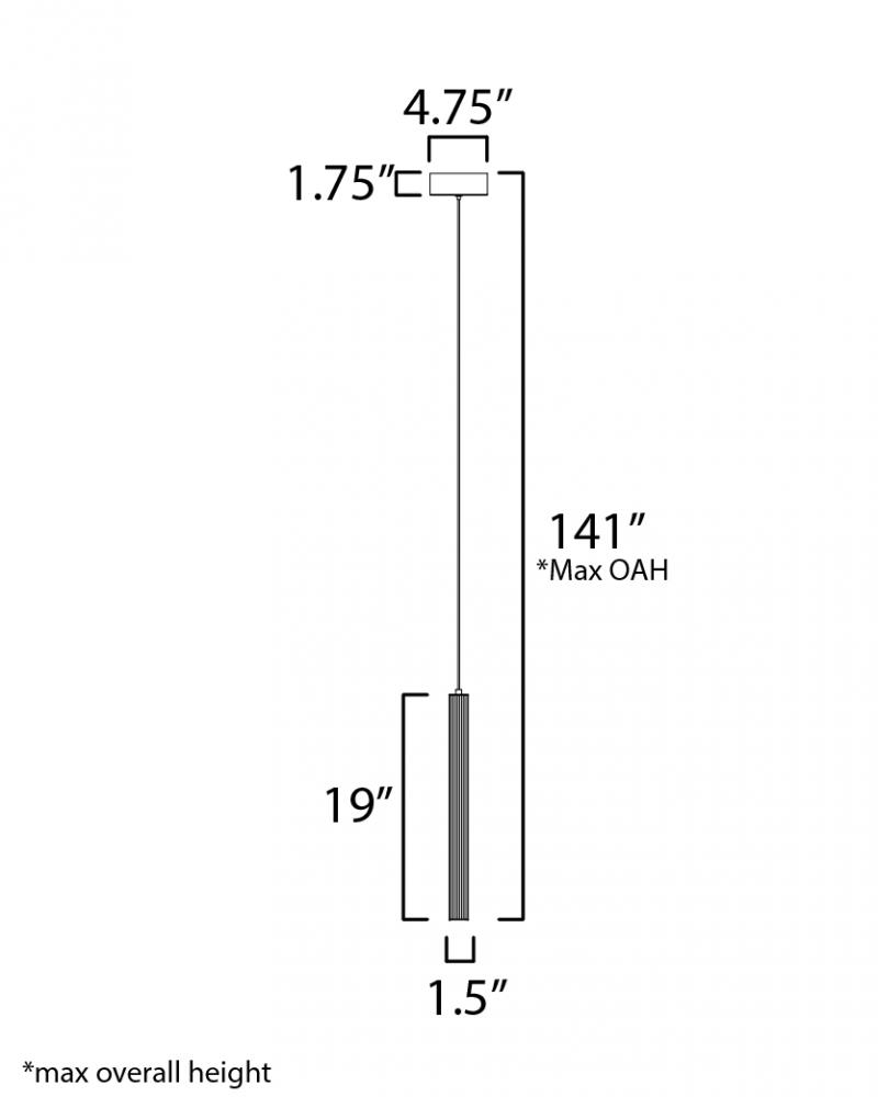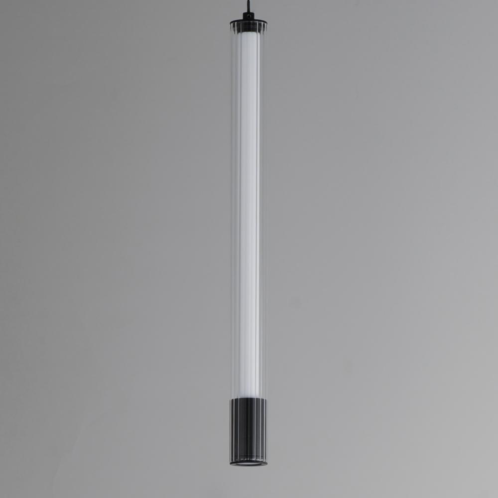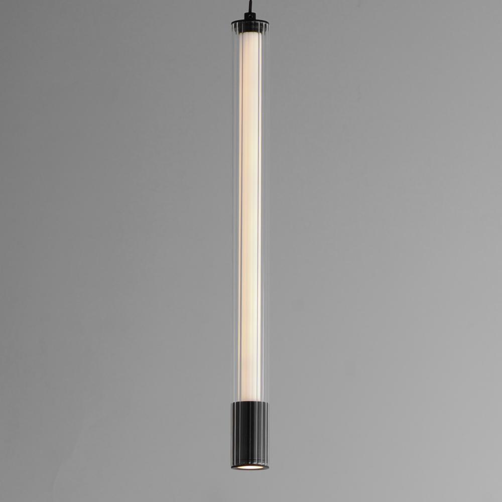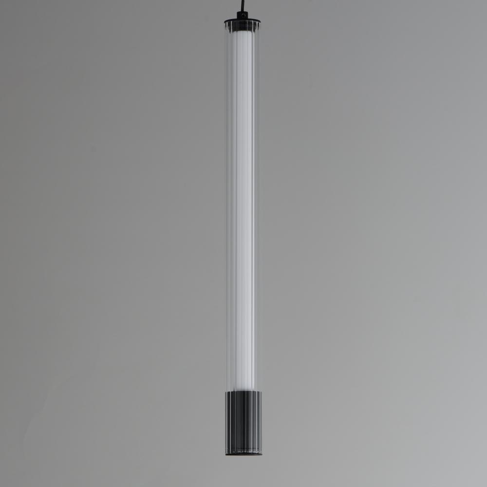 A central, cylinder diffuser of opal white acrylic diffuses LED lighting within a cavity of thin ribbed glass of various lengths. Both imaginative and functional, the bright pendants encase an additional down light recessed within a Polished Chrome, Natura