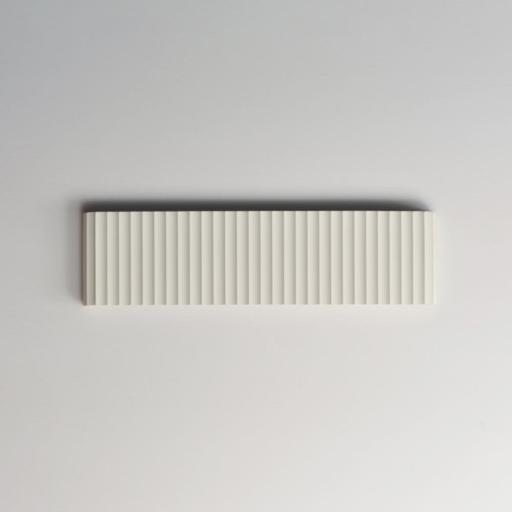 Long spans of fluted concrete panels blend Western classicism with modern technology. Scalloped concrete is finished in a Chalky White finish and suitable for damp locations. Choose from stem hung pendants or backlit wall panels that provide ambient light