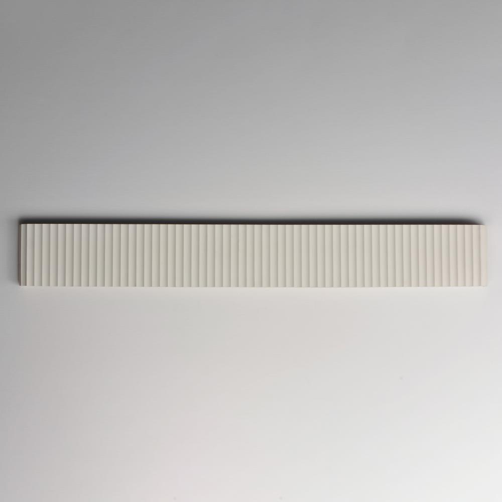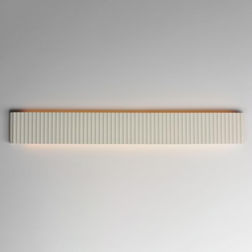Long spans of fluted concrete panels blend Western classicism with modern technology. Scalloped concrete is finished in a Chalky White finish and suitable for damp locations. Choose from stem hung pendants or backlit wall panels that provide ambient light
