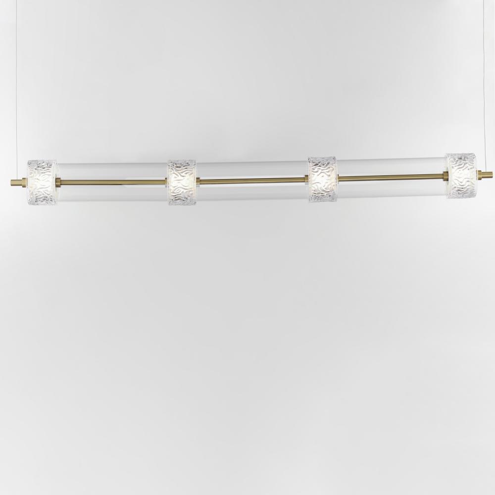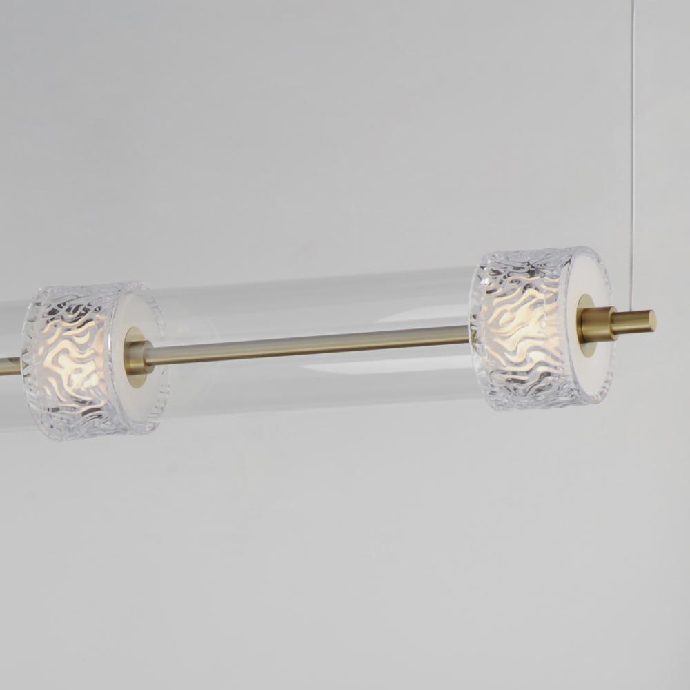 Segments of Clear glass cylinders are separated by distinctly rippled Clear crystal fonts on a thin Natural Aged Brass frame. The translucent segments are backlit with integrated LED illumination creating an airy, ethereal composition of glass textures. Av