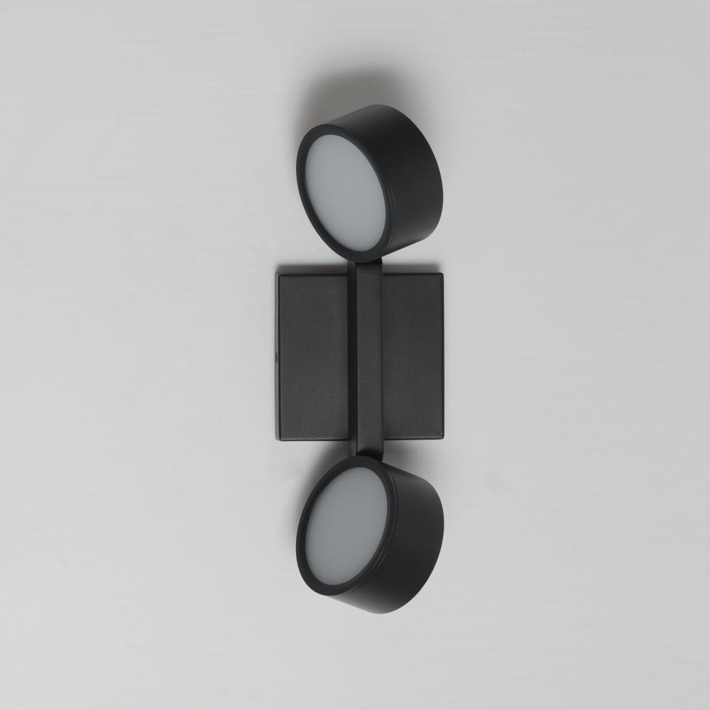 A modern matte black frame crafted with rectilinear tubing supports circular LED light modules. Designed to appear as if they are facing each other in an embrace, the modules create a harmonious and dynamic aesthetic. The two modules, positioned at opposit