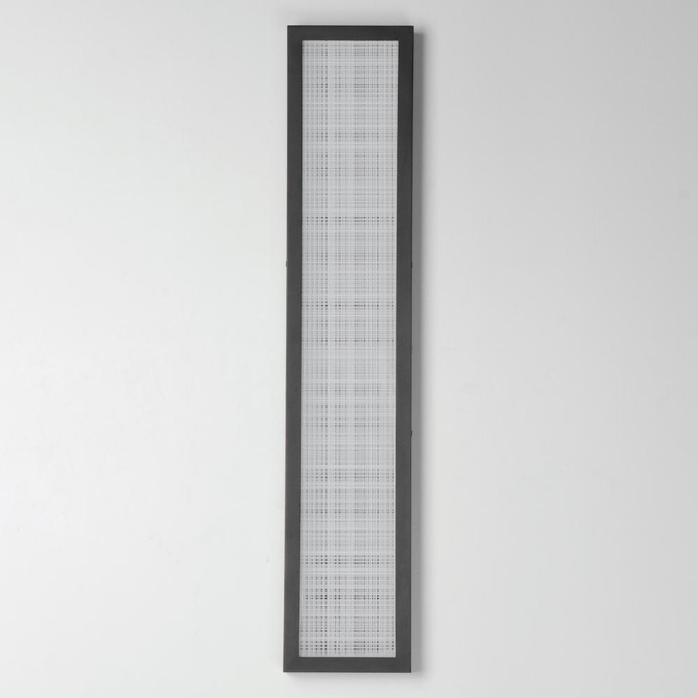 An internally illuminated shadow box is encased in glass with a tartan plaid pattern engraved to mimic linen. The back plate features a polished stainless steel plate adding an almost infinite dimension to the pattern. Constructed of aluminum in Matte Blac