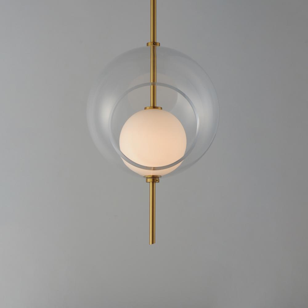 Class and character describe these unique LED light pendants. Start by taking a spike in Natural Aged Bass and stick it through multiple layers of glass globe shades. The outer layer is an oversized Clear glass with a slanted opening exposing a smaller Whi