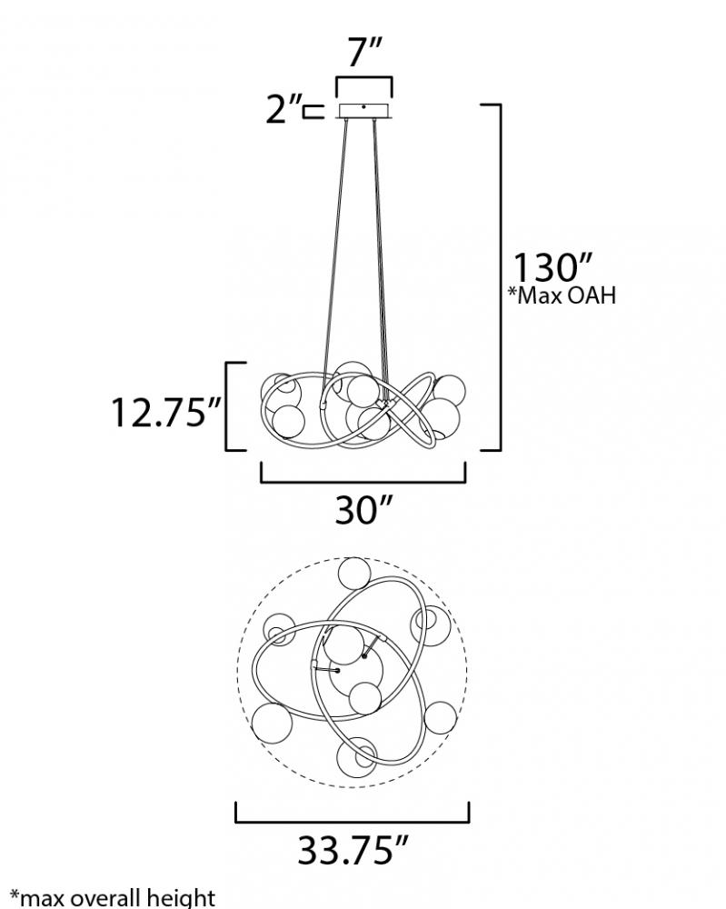 In a galaxy of light, ribbed and tinted glass is supported by swooping arcs of circular tubes. The Gold frame supports glass globe shades colored in Amber and Smoke tints that encase LED lamps provided. The single pendant has an over-sized spiraling glass