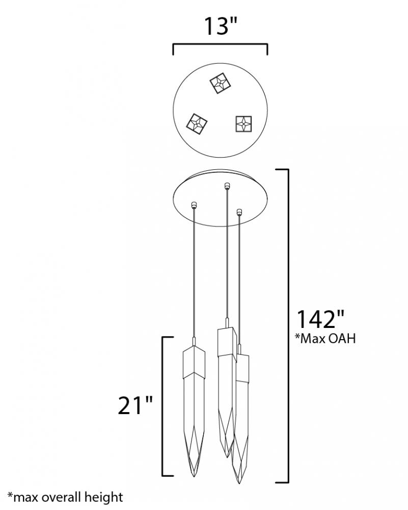 Stalactites of Clear Beveled crystal suspend from your choice of Polished Chrome or Black supports, can be hung at various heights to create a spectacular array. The crystal shimmers as light diffuses through the facets powered by 90 CRI LED dimmable modul