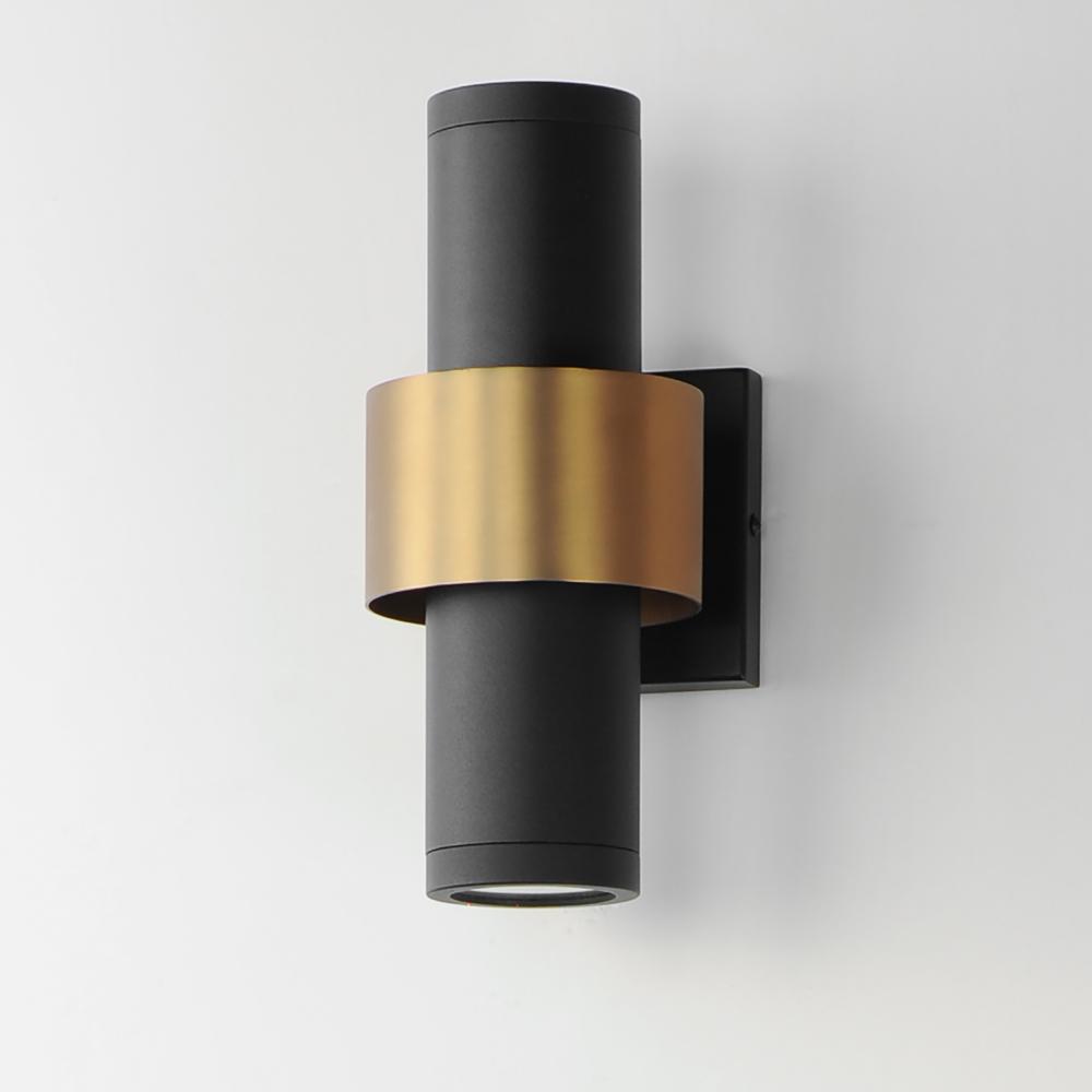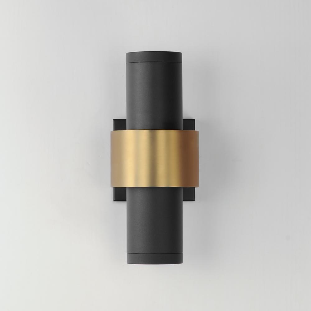 Inspired by the best-selling indoor series, this popular collection has now been created to enhance your outdoors. Tubular shaped sconces finished in Sandy Black with a Gold stainless steel band provide light from the bottom as well as a reveal behind the