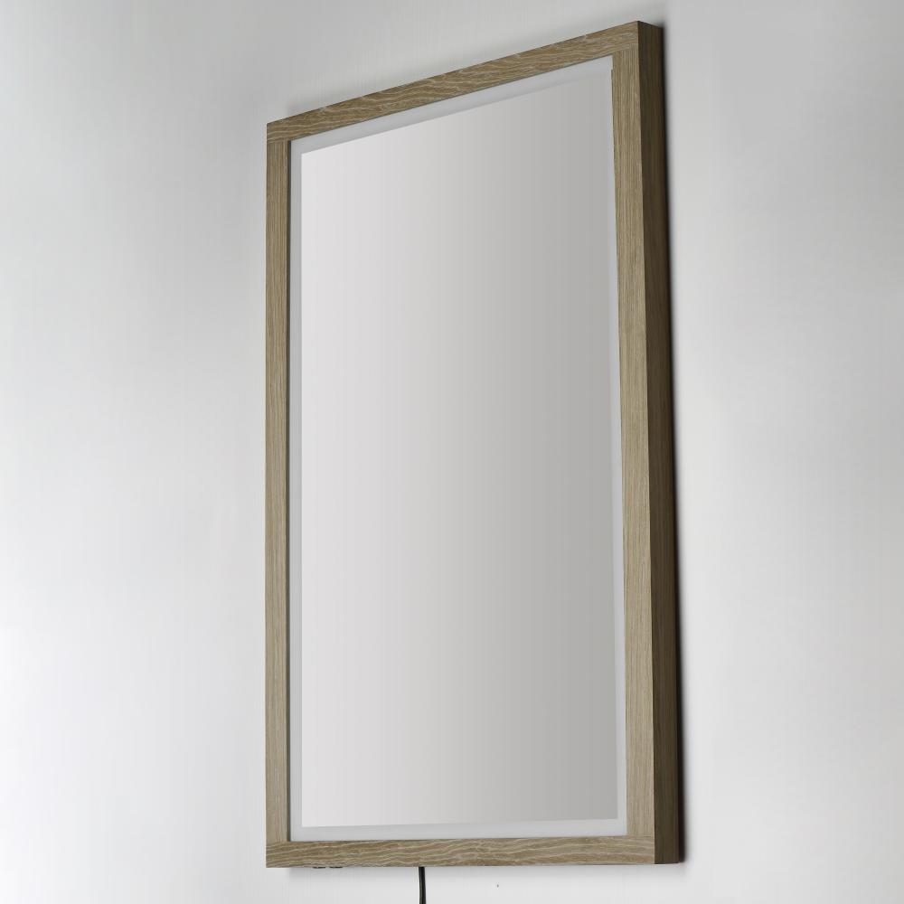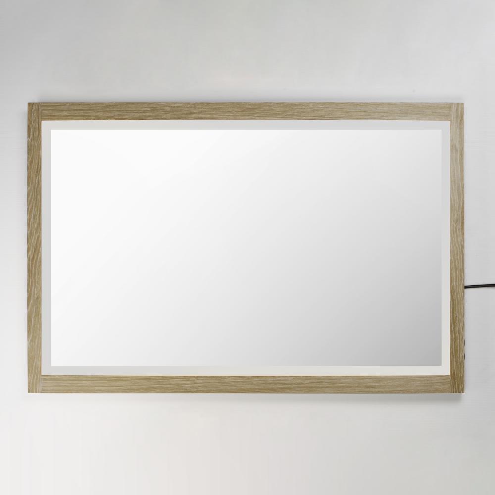 A wood-framed mirror is offered in a choice of Walnut or Distressed Oak, combining natural elements with modern functionality. A 2-inch frosted band along the frame's interior is backlit with LEDs, providing optimal illumination above a vanity. A discr