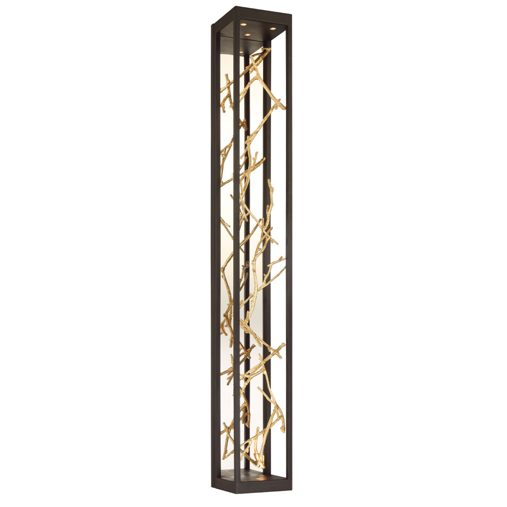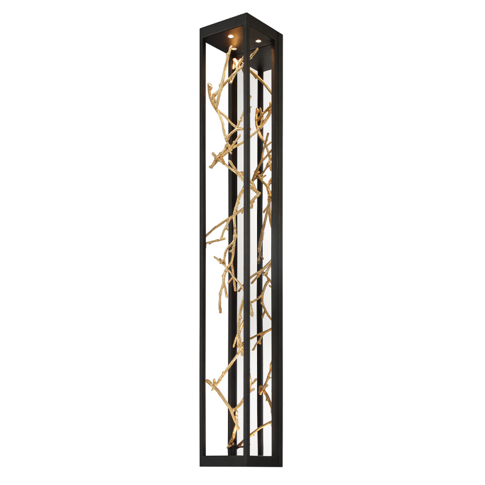 Free-flowing, gilded branches of gold and silver float elegantly within a stylish open cage constructed of cast brass and finished for the rigors of outdoor environments. The thin twigs are handcrafted with metal foil and accentuated by pinhole recessed LED lighting to add a luxurious glow to this nature-inspired collection.