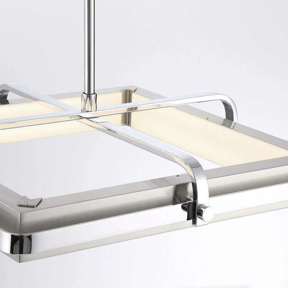 A thick metal band encircles this pronounced industrial design. The squared ring supports integrated LED for an inward glow, while the polished chrome complements the nickel for a strong composition.