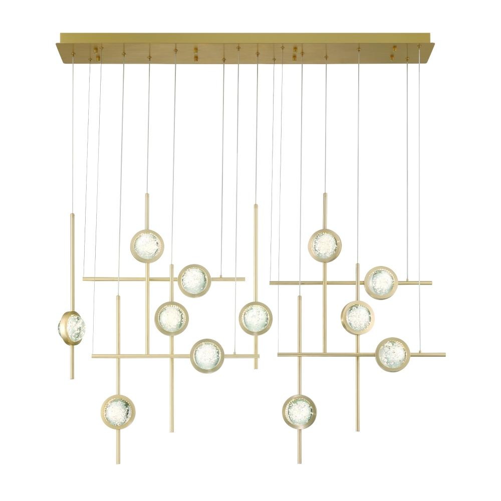 Various sized anodized rods suspend vertically in black or gold finishes. Each rod is furnished with a clear seeded glass orb that perfectly sits within an anodized ring.