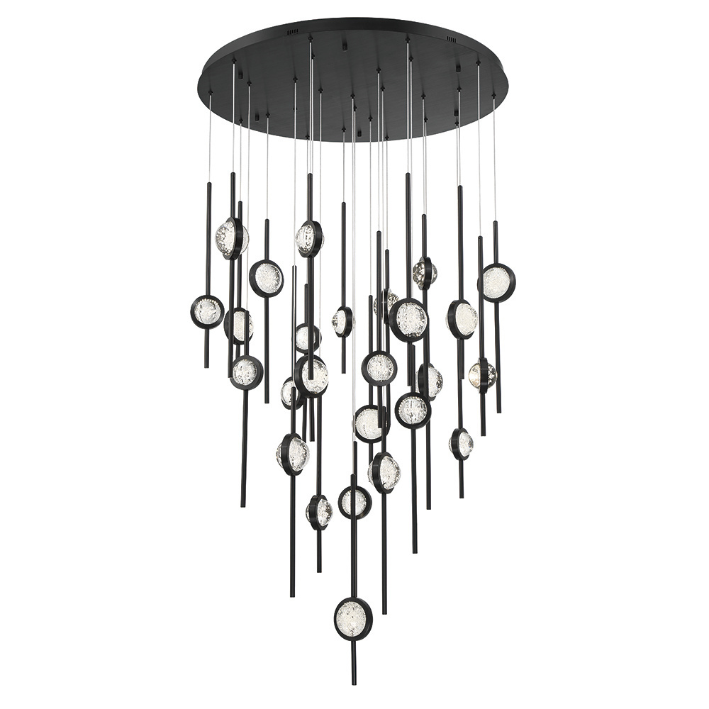 Various sized anodized rods suspend vertically in black or gold finishes. Each rod is furnished with a clear seeded glass orb that perfectly sits within an anodized ring.