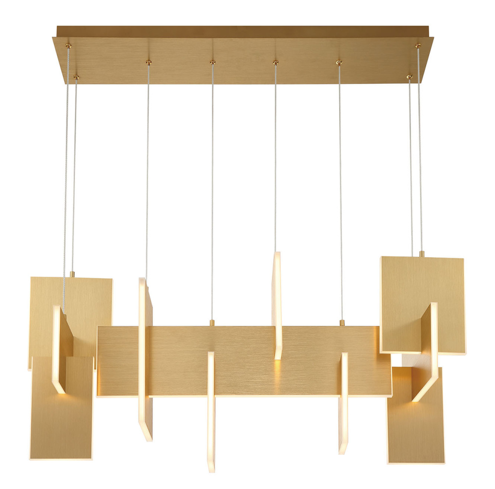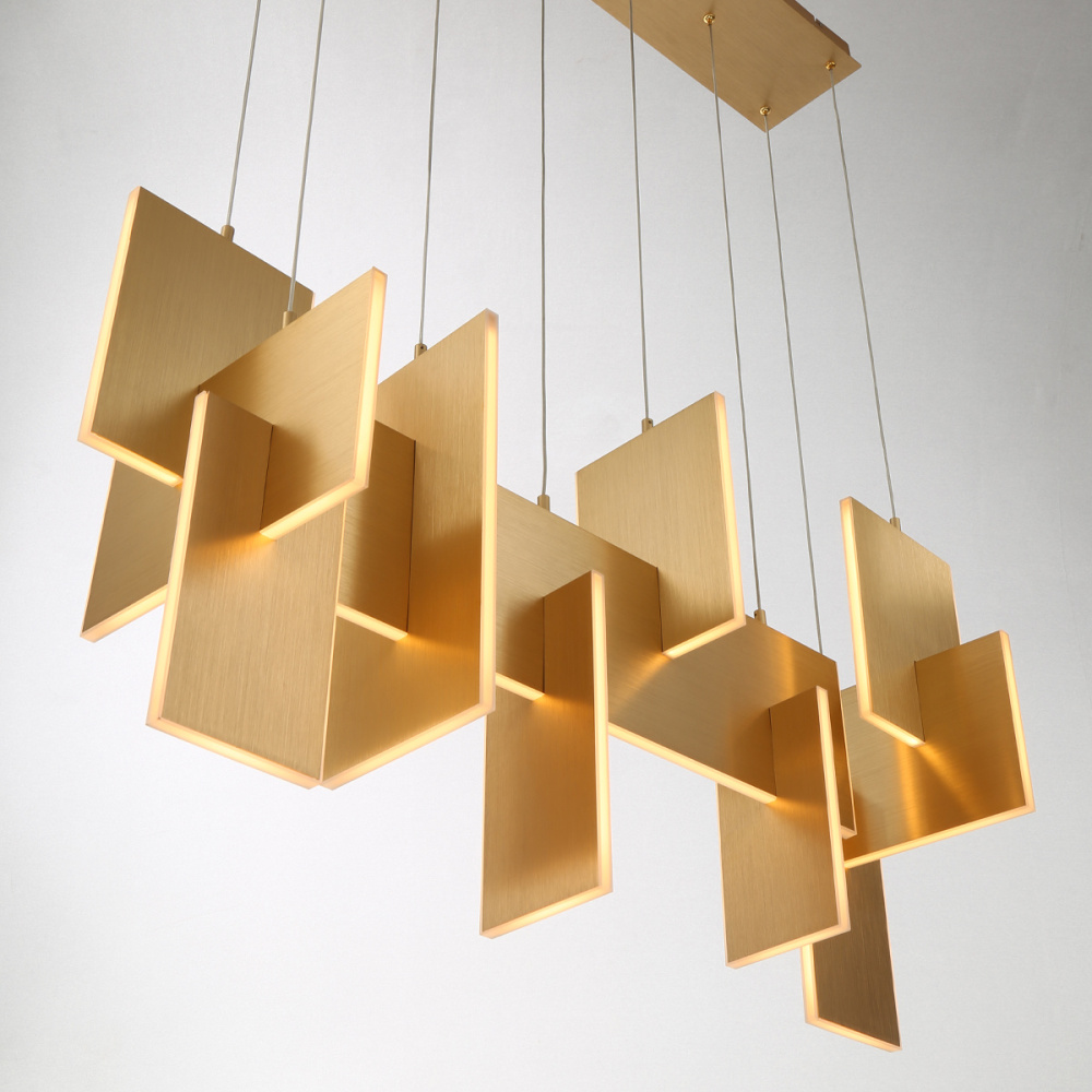 Slim, edge-lit LED panels are creatively positioned to intersect in a dynamic, whimsically modern design. A continuous run of LED lights delivers seamless, multi-directional lighting. The interlocking aluminum panels are laser cut for added precision and anodized to create a durable, corrosion-resistant finish that’s available in either gold or black.
