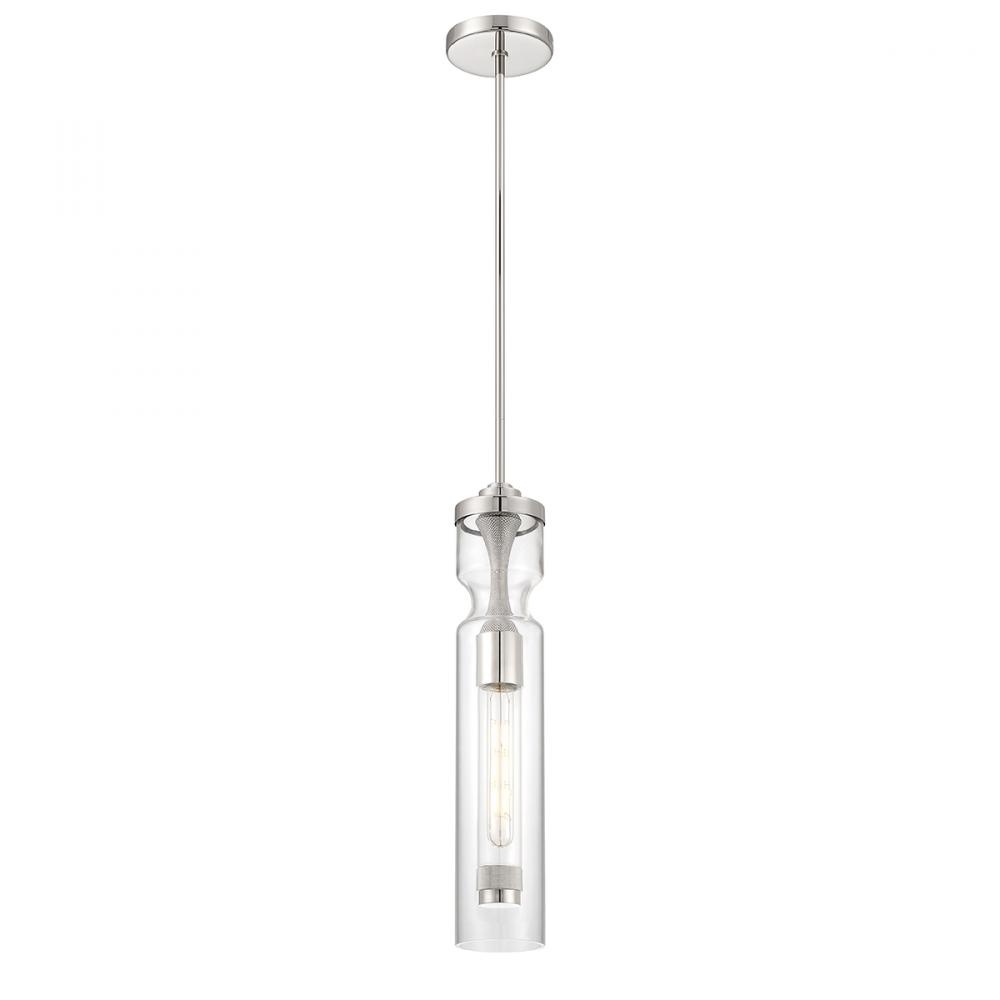 Antique electric insulators are constructed of very thick glass and pinched to accommodate wrapping. The Mistero pendant has stretched and elongated this shape into a slender silhouette of light. Machined knurling details create focal points, enclosed around the thick clear blown glass shade.