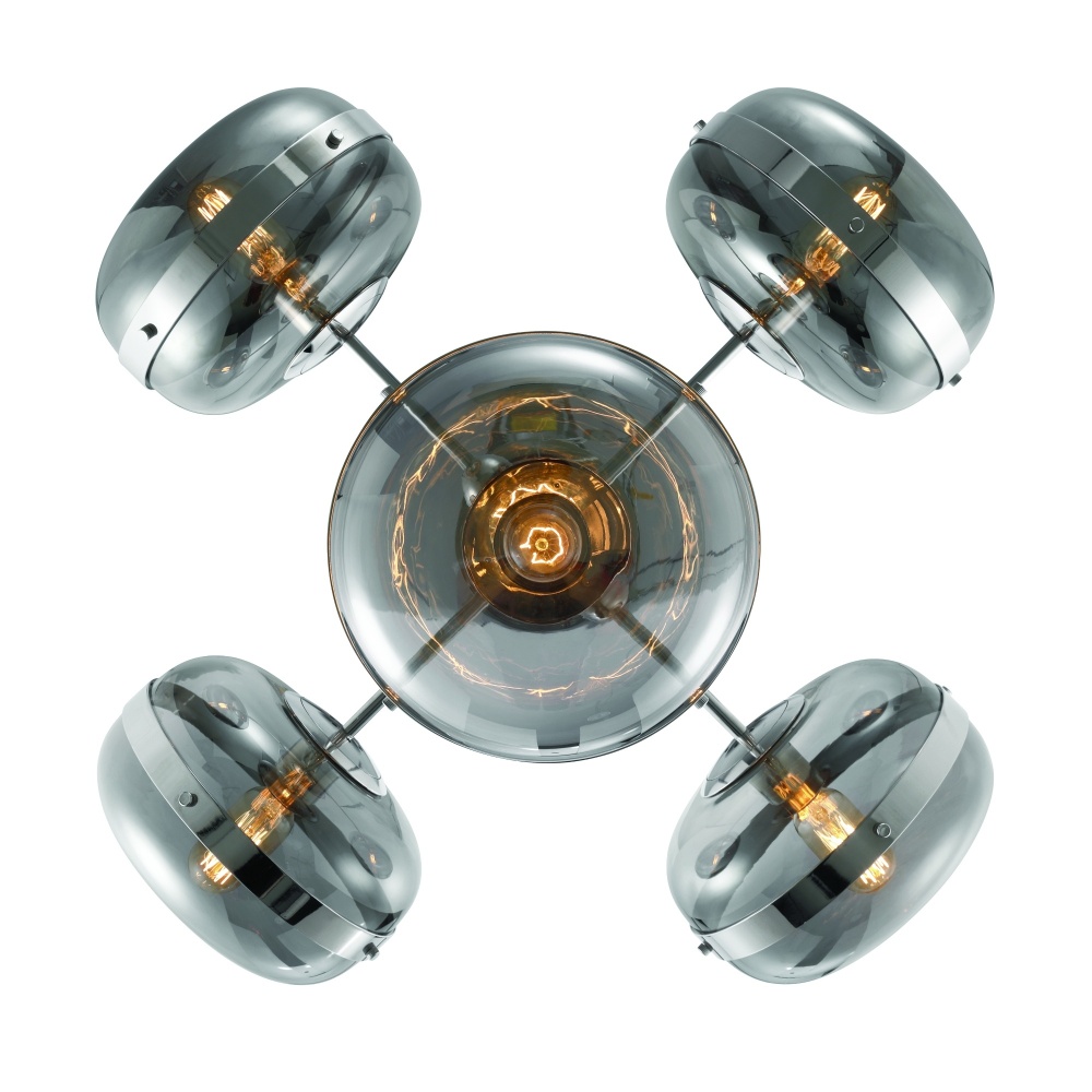 A band encircles each glass orb that beautifully reflects a warm glow from the vintage lights within. The metal support creates an inviting counterpoint to the austere design