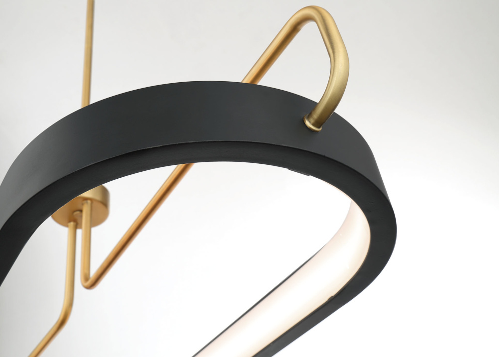 A black ring of LED light is suspended by two satin nickel or gold-finished metal rods on either side. An unconventional approach to a simple concept, this slightly retro yet trendy line features a simplicity that still attracts attention. Integrated LED lighting provides a continuous, seamless source of brilliant illumination.