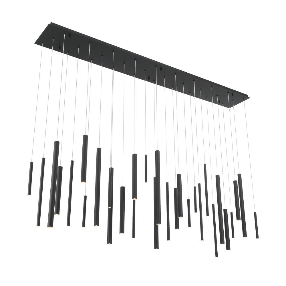 An assortment of tubes suspended at different lengths and thicknesses to create a visually dynamic composition. The aluminum rods house LED lights at one end for collective spot lighting while adding a playful twist to its minimal design.