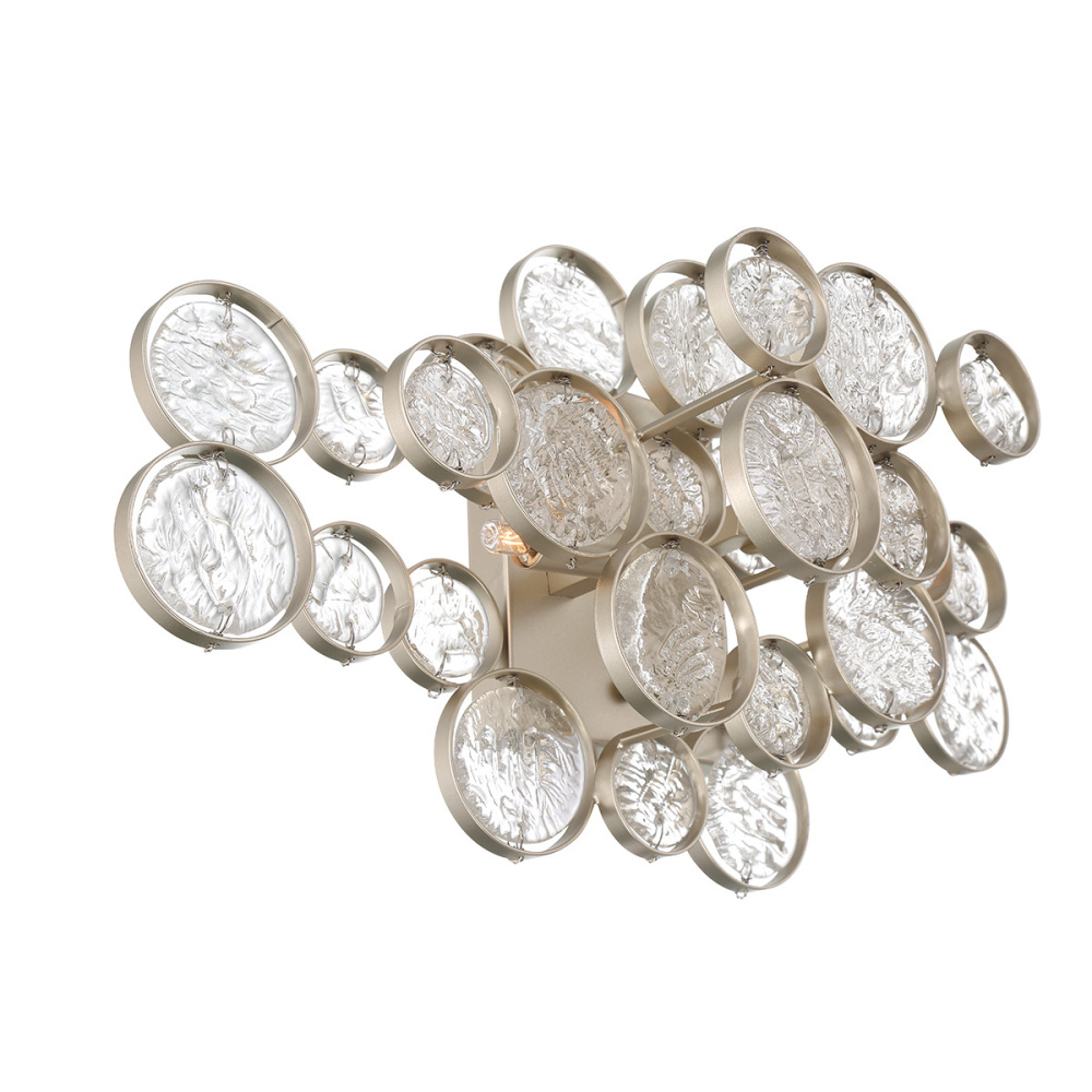 Intricate champagne silver or antique gold frames delicately hand strung glass wafers. The pressed glass, each one a distinguished piece of craftsmanship, float beautifully like clouds.
