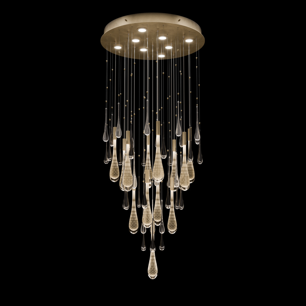This LED pendant captures the beauty of motion suspended in time-artisan-blown glass “rain” drops infused with swirling mist and illuminated from within. Offered in Silver, Gold, or Copper drops, each paired with clear and black droplets and complemented by a hand-applied ombré finish that enhances its luminous depth.
