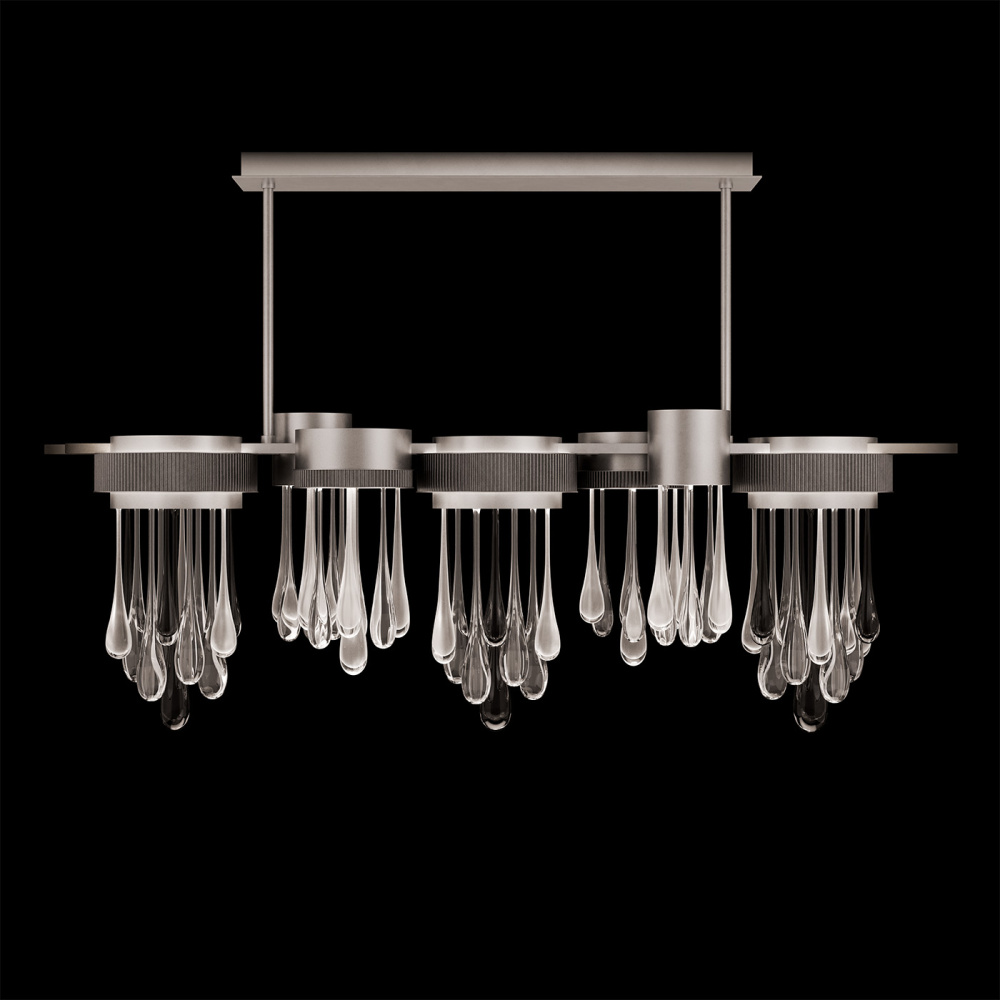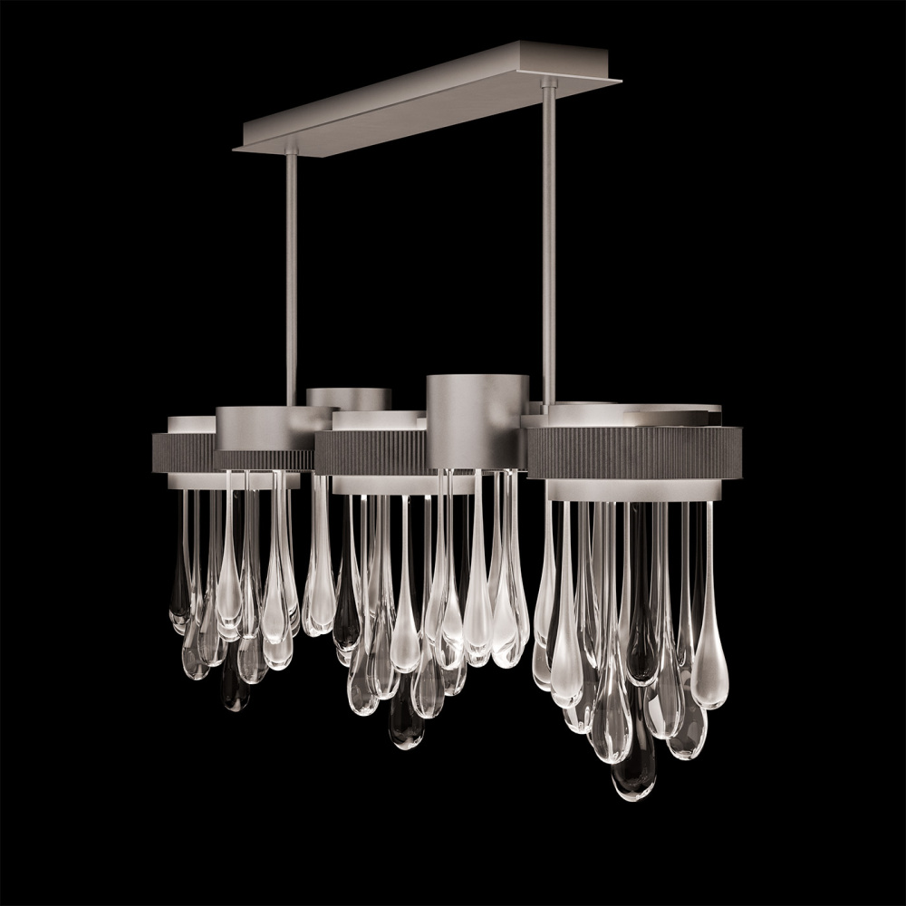 This LED pendant captures the beauty of motion suspended in time-artisan-blown glass “rain” drops infused with swirling mist and illuminated from within. Offered in Silver, Gold, or Copper drops, each paired with clear and black droplets and complemented by a hand-applied ombré finish that enhances its luminous depth.