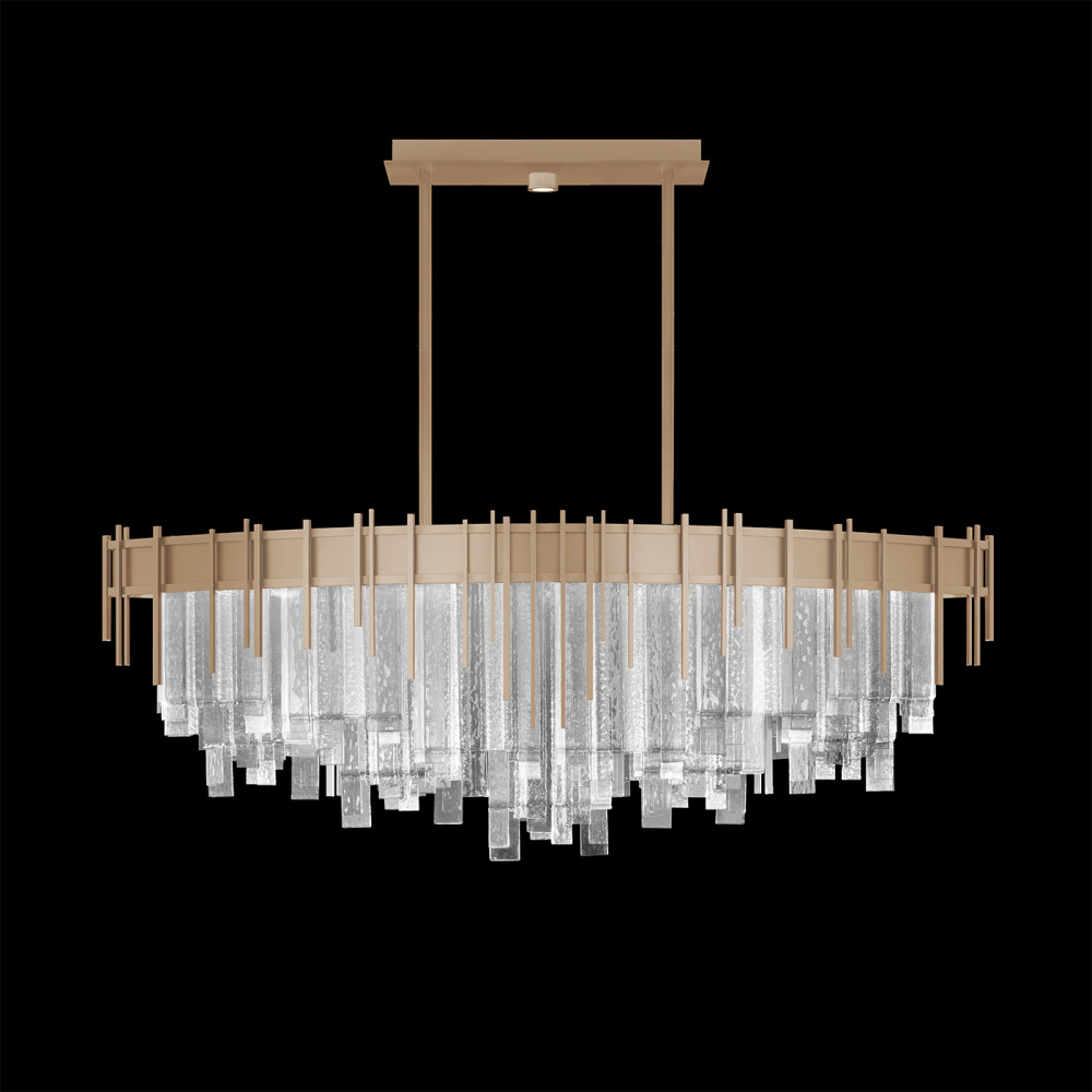Inspired by the love of Jazz and the harmonious arrangement of musical notes, this Arpeggio pendant features panels of cascading glass fused together to create a chorus of visual delight.The collection emulates melody and movement, characterized by its multi-layered design of fused-glass panels, combining clear and colored glass to create a captivating, textured look.Color glass options feature textured glass panels masterfully layered and fused together in clear, or multi-tonal mix of clear, smoke, and bronze, with Midnight Steel or Soft Gold Leaf finish options.
