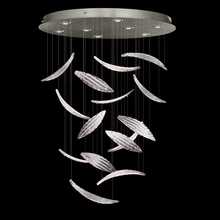 “Frozen Pages” conceptually marks the moments in life we wish we could freeze in time. Each “Frozen Page” is composed of two pieces of fused glass covered with a layer of crystal frit creating a frozen look. By fusing and slumping multiple forms of movement, “Frozen Pages” appears to drift through a room creating flow and interest. Illuminated from a gold leaf canopy and suspended by adjustable cables. This American handmade round fixture features 15 glass “Pages” and is ideal for low ceilings.