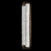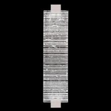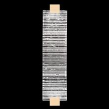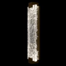 Indoor/outdoor aluminum sconce features a three-dimensional contrast of deep textured and polished cast glass. This stunning landscape of the glass, illuminated by waterproof LEDs, is available in clear (shown) or highlighted with antiqued gold leaf. Choice of three finishes, champagne tinted gold leaf finish or silver leaf for indoor only, and a hand rubbed black iron for indoor and outdoor use.