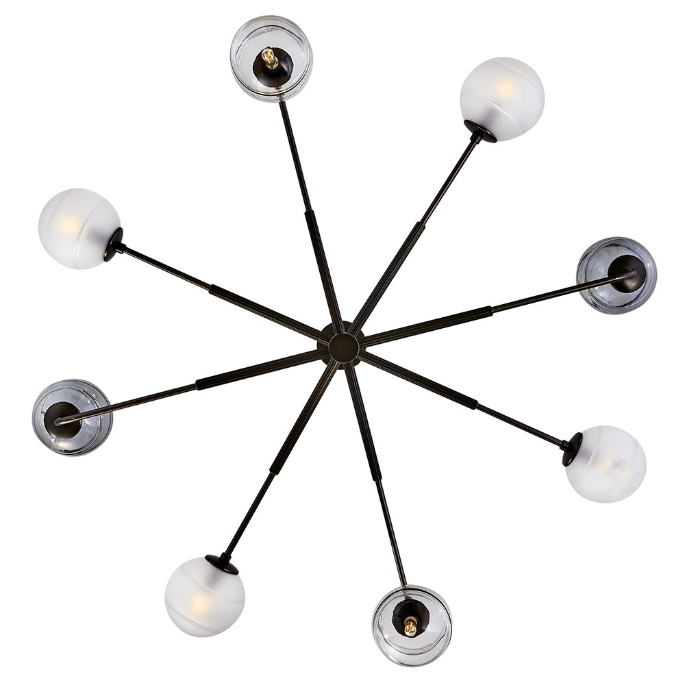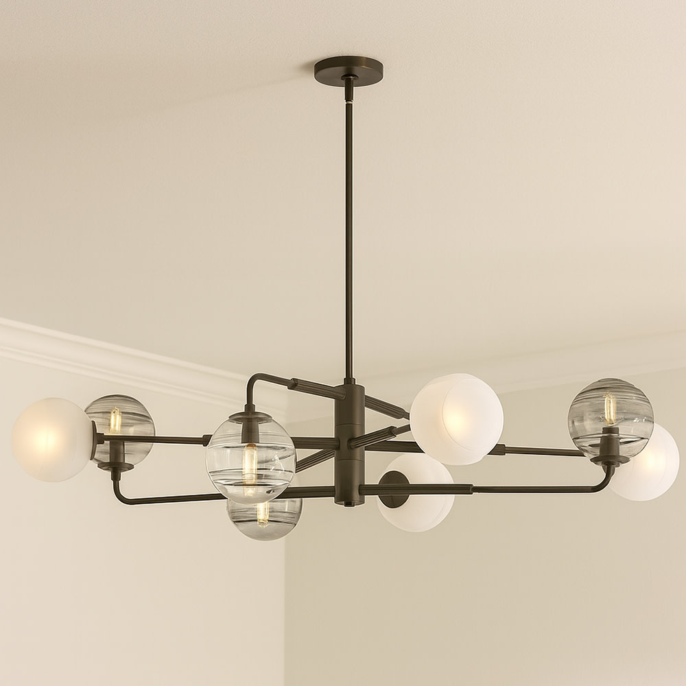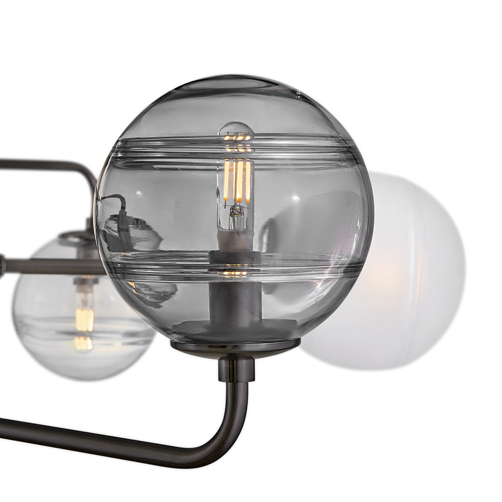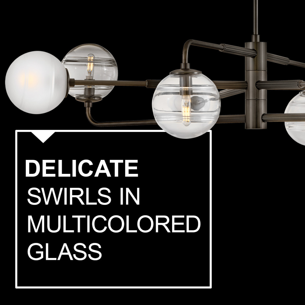 Artfully combining unexpected materials, Oberon's ribbed stems create a tailored, transitional silhouette. Delicate swirls detail spherical shades in multicolored glass.