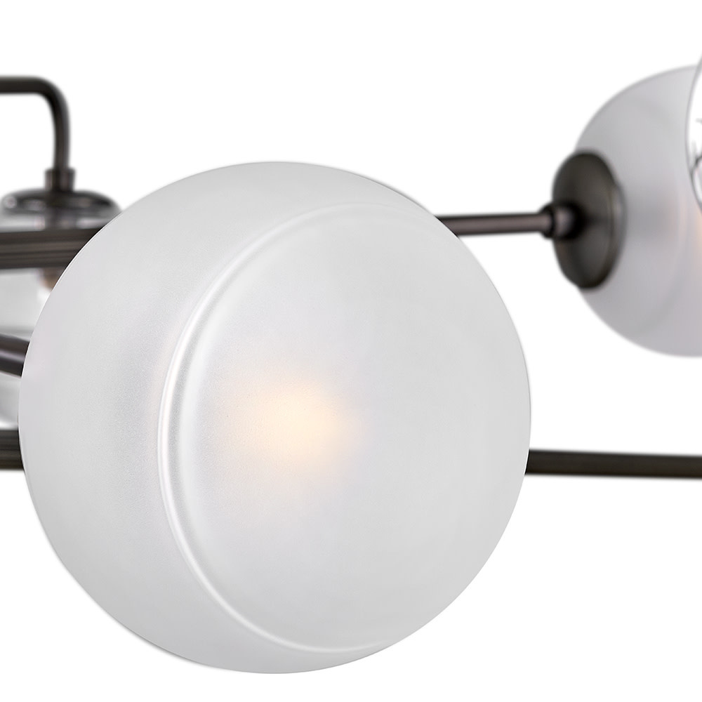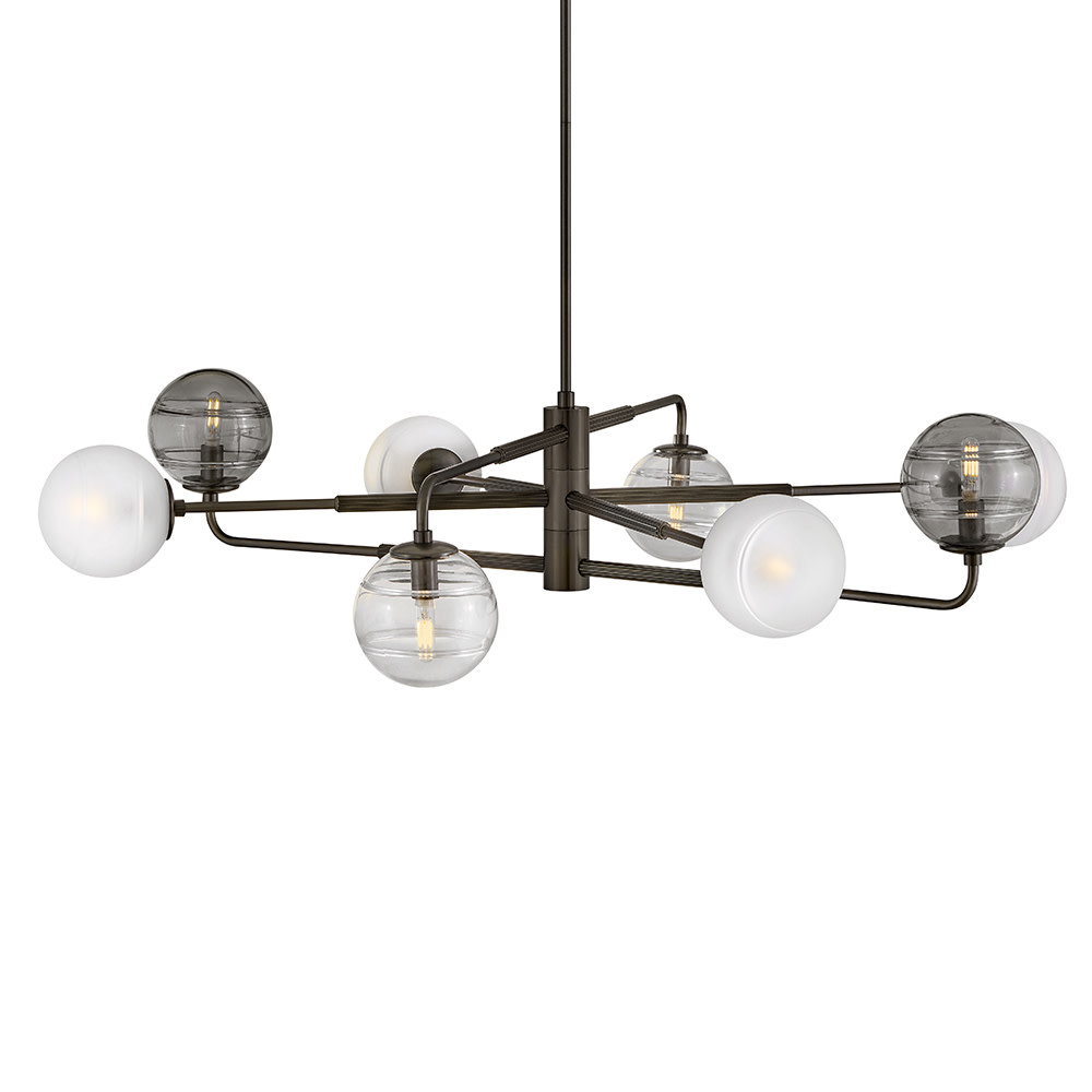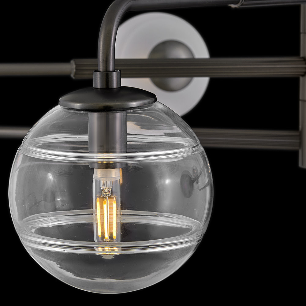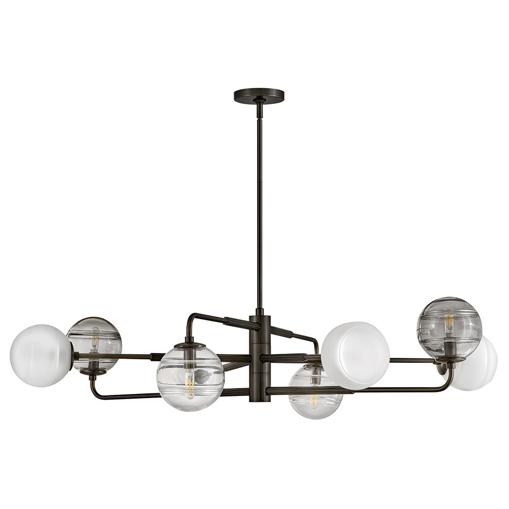 Artfully combining unexpected materials, Oberon's ribbed stems create a tailored, transitional silhouette. Delicate swirls detail spherical shades in multicolored glass.