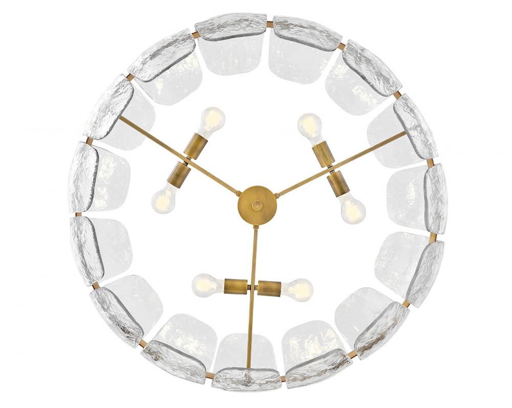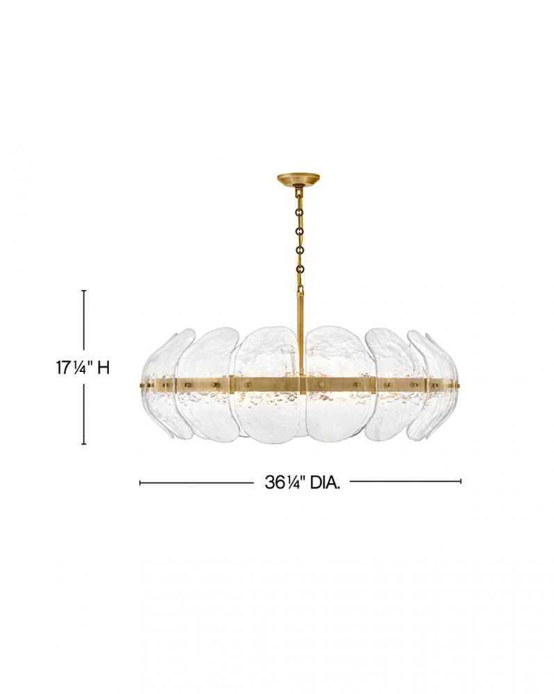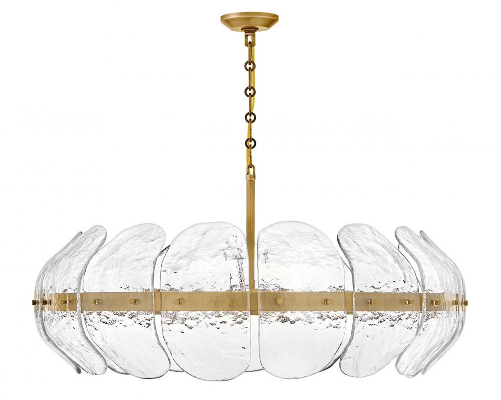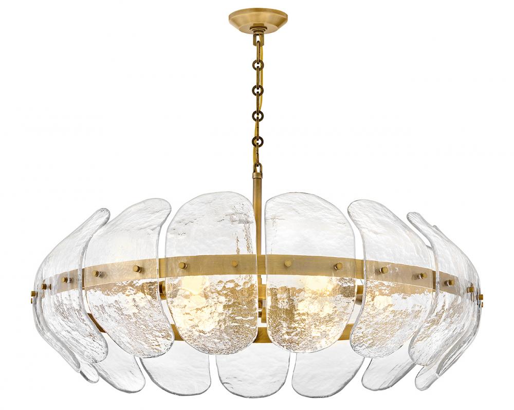 Inspired by the organic elegance of blooming water lilies, Lillia’s large shade is formed from gently curved glass panels. Subtle handcrafted texture creates natural variations in illumination, accentuated by a classic Heritage Brass finish.