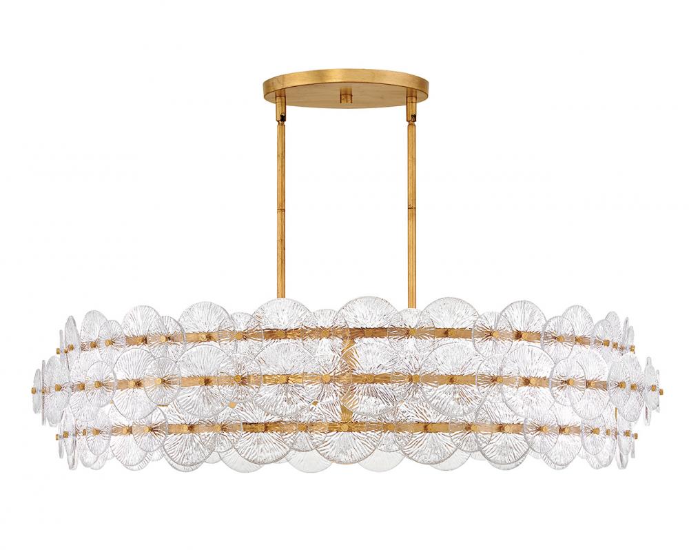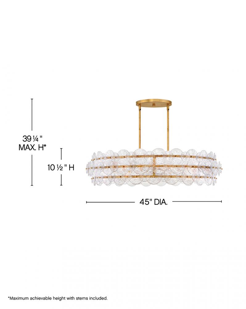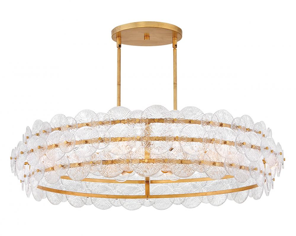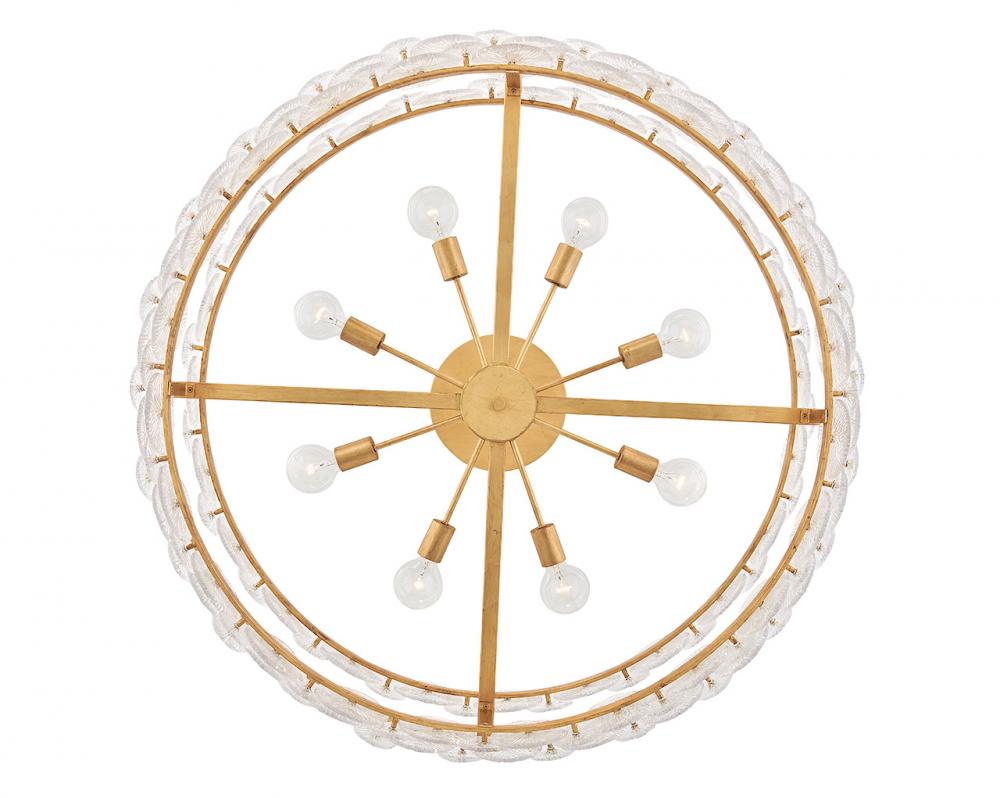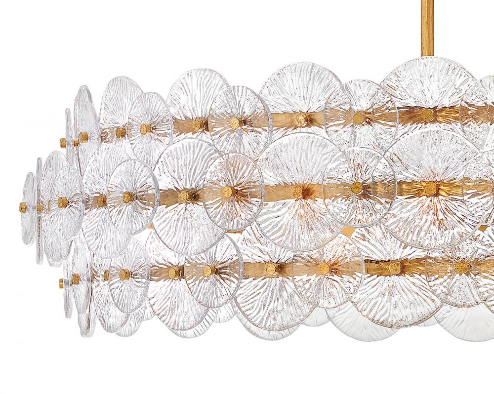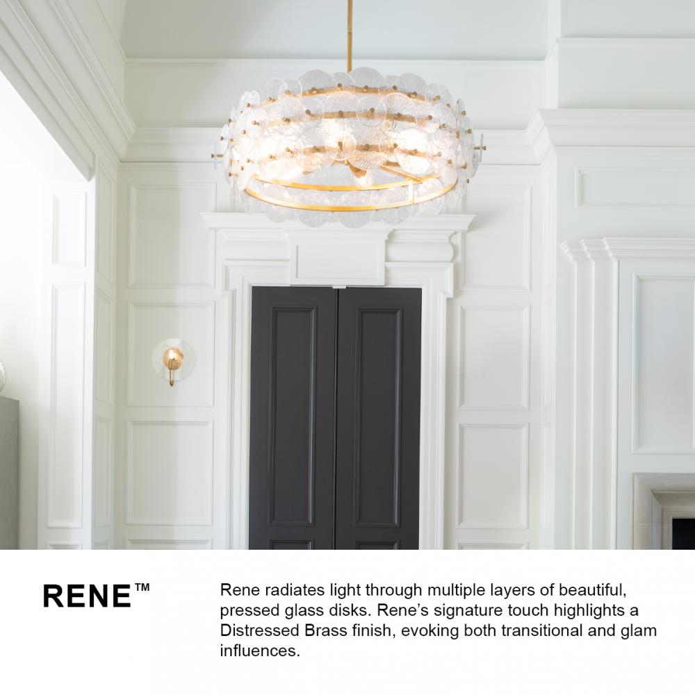 Rene radiates light through multiple layers of beautiful, pressed glass disks. Rene’s signature touch highlights a Distressed Brass finish, evoking both transitional and glam influences.