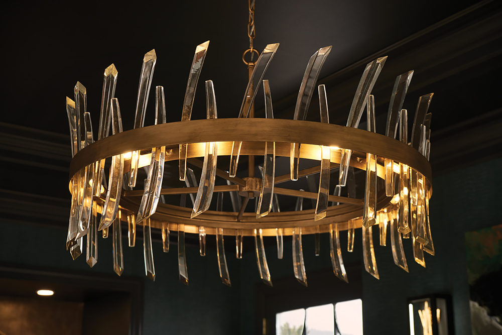 A compelling design that captivates from any angle, the Revel family gleams with sophistication. Luxurious crystal rods are honed into unexpected asymmetrical formations to produce an organic elegance that is both raw and refined. Revel’s linear and circular chandeliers are available in both Burnished Gold and rich Black finish options.