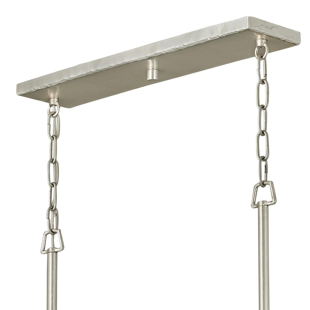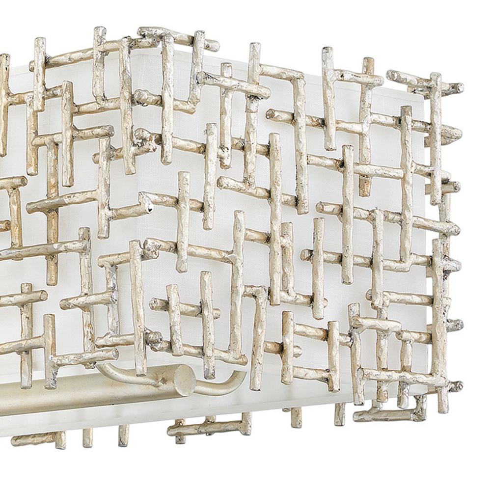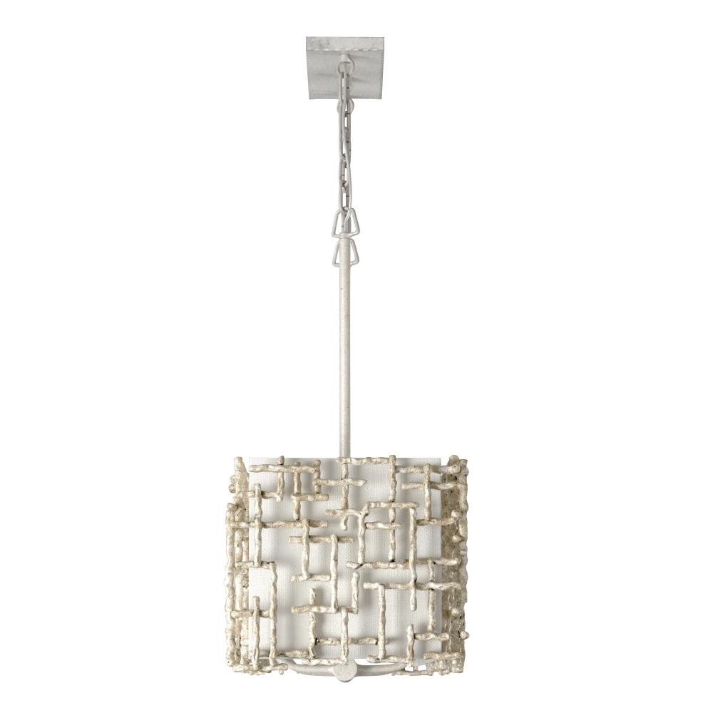 Farrah's contemporary design is bold and sculptural, while achieving an optical airiness. The hand-hammered crosshatch bars gleam in a hand-applied Silver Leaf or Burnished Gold finish with artisanal detailing that carries through to the canopy detail. Set against a White Linen shade, Farrah creates a look of deconstructed; modern elegance.