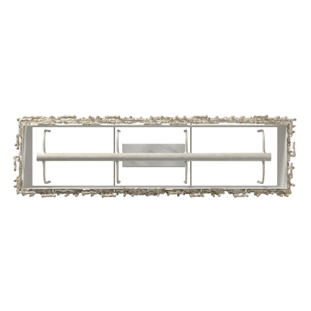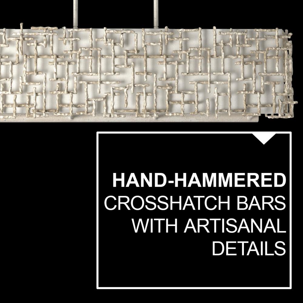 Farrah's contemporary design is bold and sculptural, while achieving an optical airiness. The hand-hammered crosshatch bars gleam in a hand-applied Silver Leaf or Burnished Gold finish with artisanal detailing that carries through to the canopy detail. Set against a White Linen shade, Farrah creates a look of deconstructed; modern elegance.