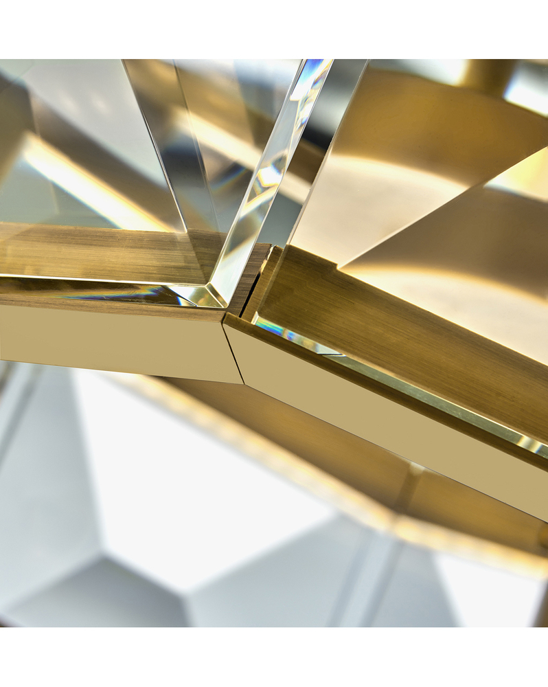 Jolie is a unique blend of sophistication, style, and technology. Integrated LEDs are sleekly concealed within gleaming Heritage Brass rings at the top and bottom of the design. Robust blocks of faceted crystal radiate with light, creating a transfixing silhouette while providing outstanding illumination.