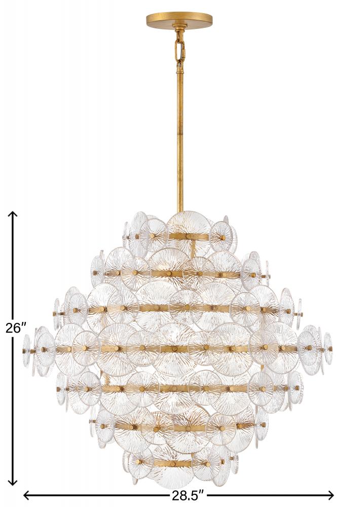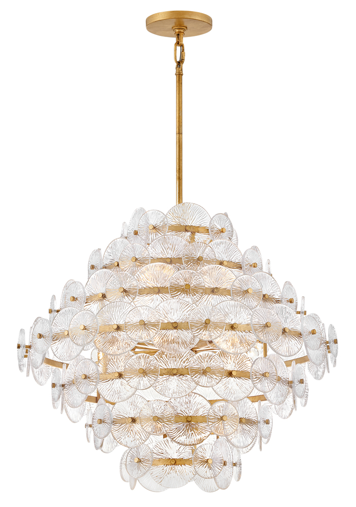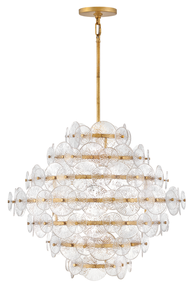 Rene radiates light through multiple layers of beautiful, pressed glass disks. Rene’s signature touch highlights a Distressed Brass finish, evoking both transitional and glam influences.