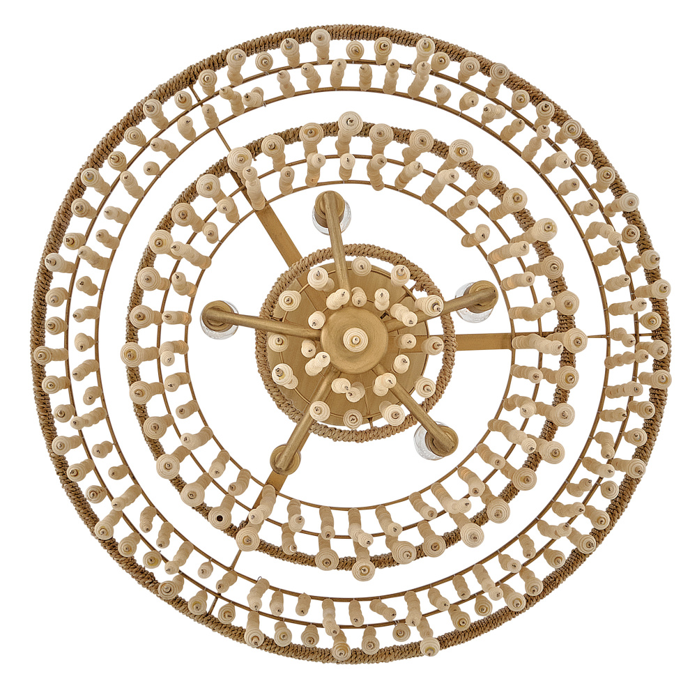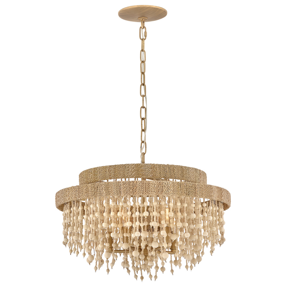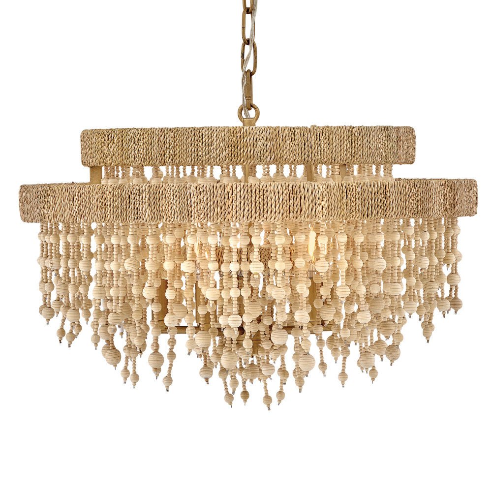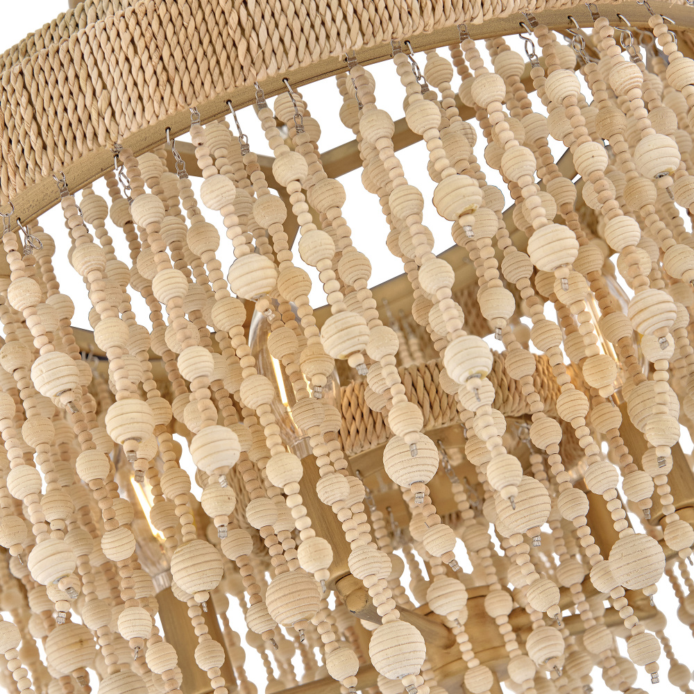 Juxtaposing unconventional materials and naturally inspired detailing with the timelessness of traditional tiered chandeliers, Freya’s cascading shade is draped with intricate beadwork. Individual strands of wooden beads are hung from hand-painted Burnished Gold frames to form bohemian curtains that cast beautiful shadows from warm candelabra lamps.