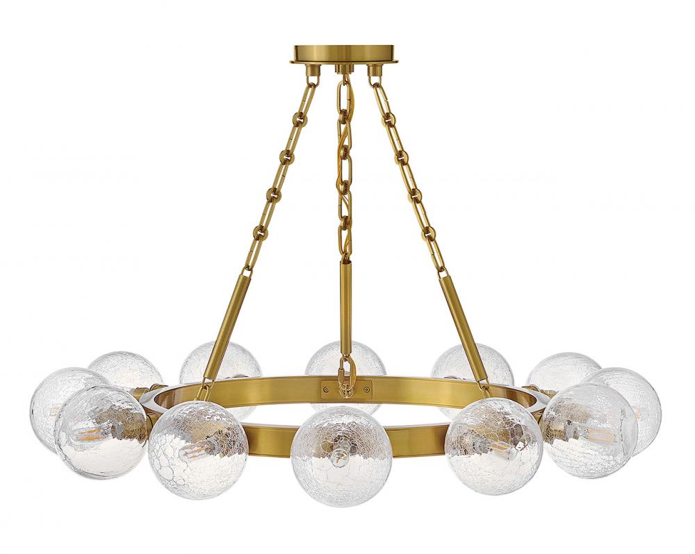 Dramatic crackled glass globes surround Coco’s timeless silhouette with unexpected, distressed detailing. Minimal framing suspended from decorative stem-to-chain uprights features a warm and inviting Lacquered Brass finish.