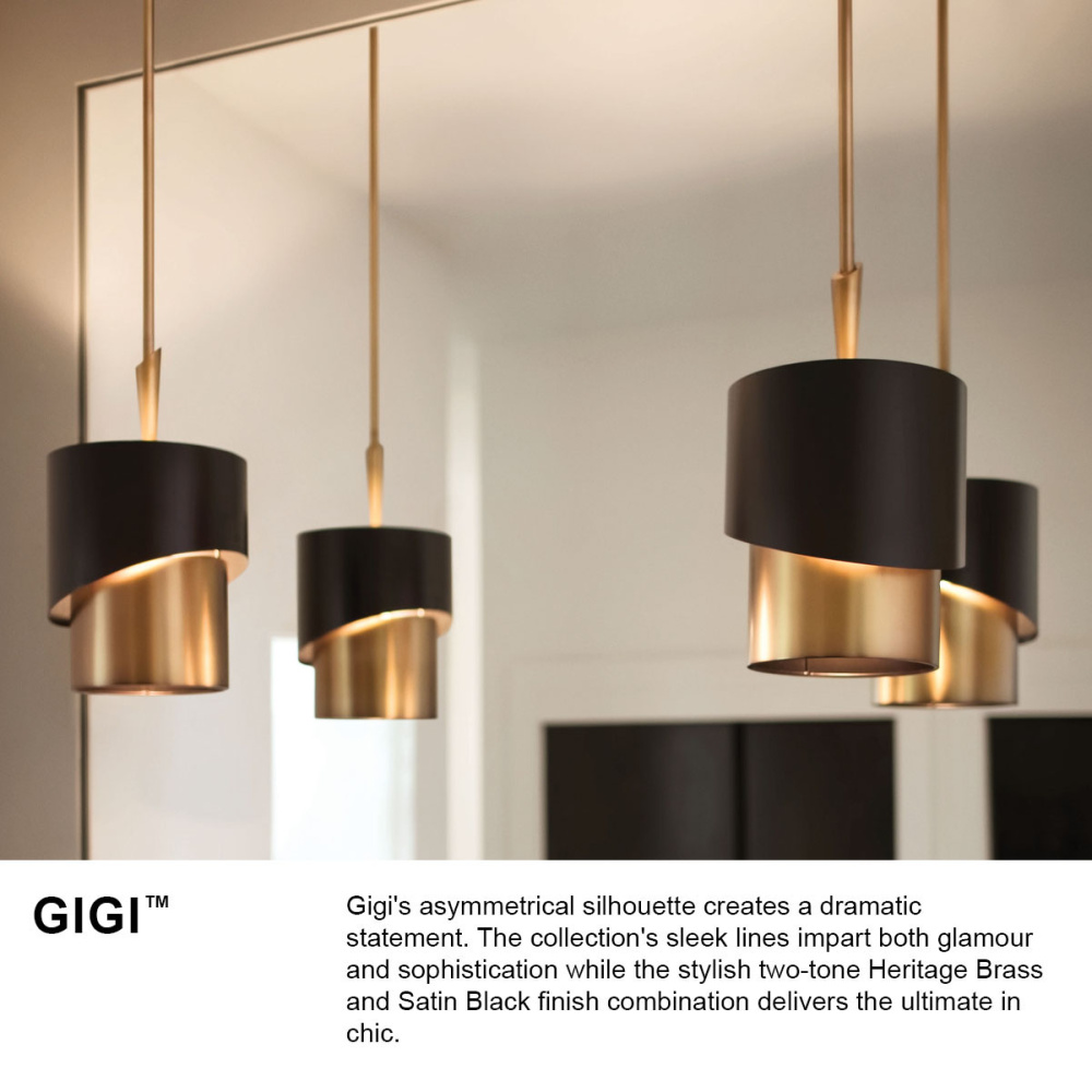 GIGI's asymmetrical silhouette creates a dramatic statement. The collection's sleek lines impart both glamour and sophistication while the stylish two-tone Heritage Brass and Satin Black finish combination delivers the ultimate in chic.