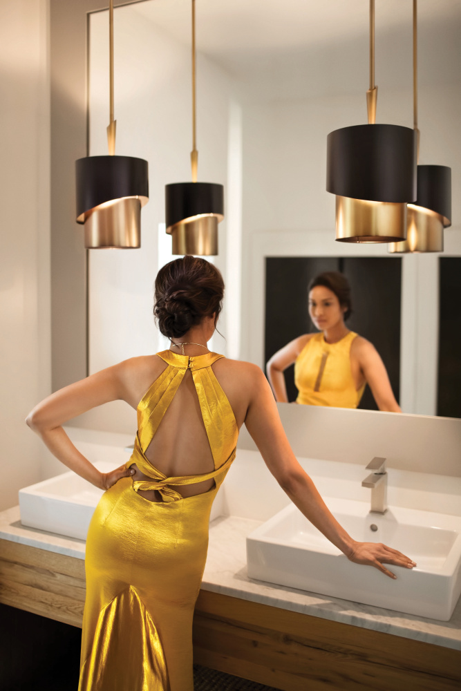 Gigi's asymmetrical silhouette creates a dramatic statement. The collection's sleek lines impart both glamour and sophistication while the stylish two-tone Heritage Brass and Satin Black finish combination delivers the ultimate in chic.