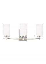 The Alturas three light vanity fixture in satin brass offers shadow-free lighting in your powder room, spa, or master bath room. The silhouette of the modern Alturas lighting collection by features an interlocking, spherical steel frame, which harkens back to the Unisphere constructed for the 1964 New York World's Fair. The minimalist Alturas Collection draws the eye to the soft, warm glow of the light emitted from the cylindrical Satin Etched glass shades. The full assortment includes three-, five- and nine-light chandeliers, a one-light mini pendant, a three-light pendant, a two-light semi flush which is convertible into a pendant, and one-, two-, three- and four-light bath fixtures. All fixtures are offered in Brushed Oil Rubbed Bronze, Brushed Nickel and Satin Bronze finishes, the bath fixtures are also offered in Chrome finish. Incandescent and ENERGY STAR-qualified LED lamping are available; all fixtures are California Title 24 compliant.